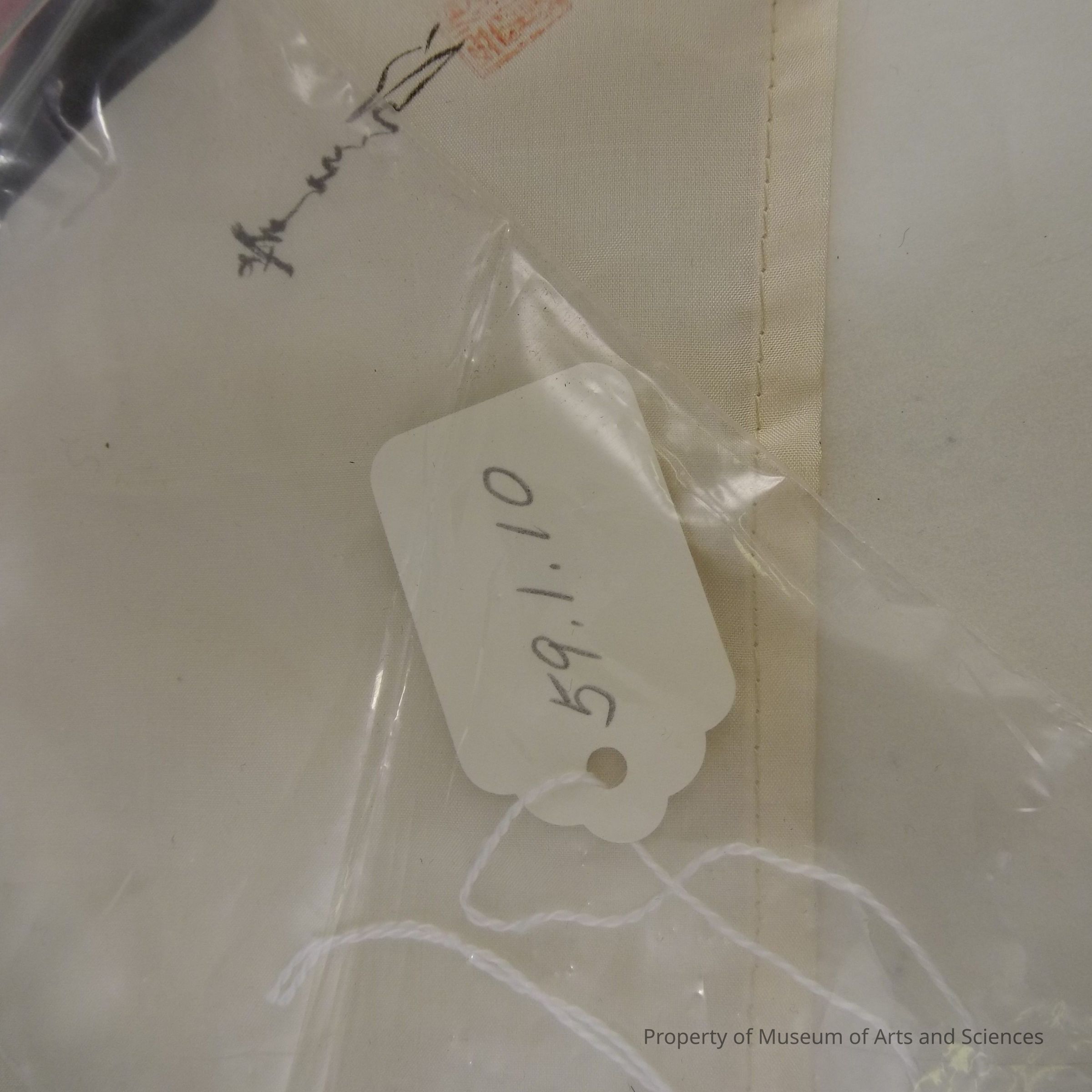 White silk, painting in center of Japanese woman wearing kimono of purple and yellow stripes with red flowers holding a small horses head in right hand Japanese characters on right and leftArtwork Details