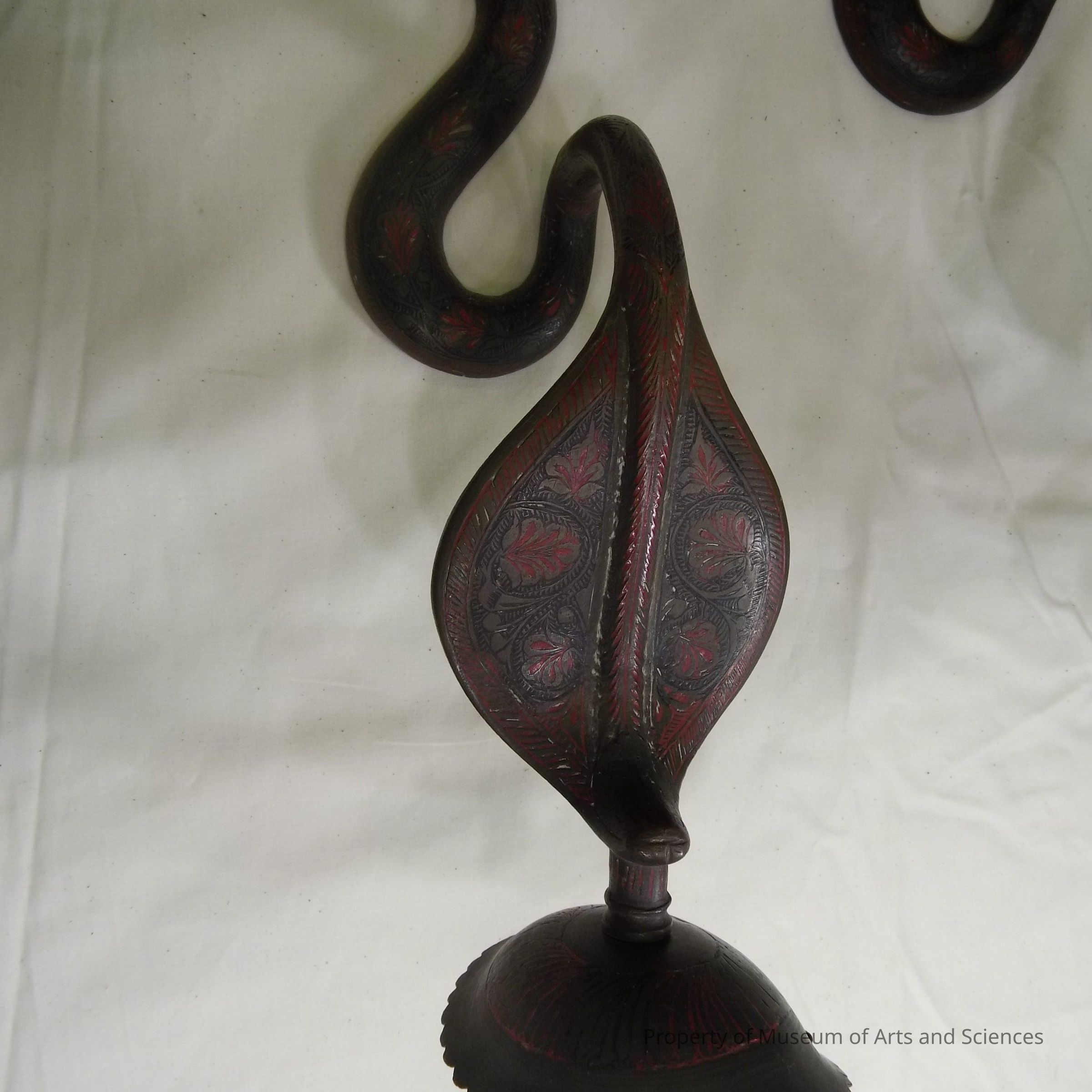 B:Bronze cobra candlesticks with engraving and red and black lacquer, bronze with flower and arabesque design engraved and filled with red and black lacquer, caandelholder at head of cobra, long curled tail.Artwork Details