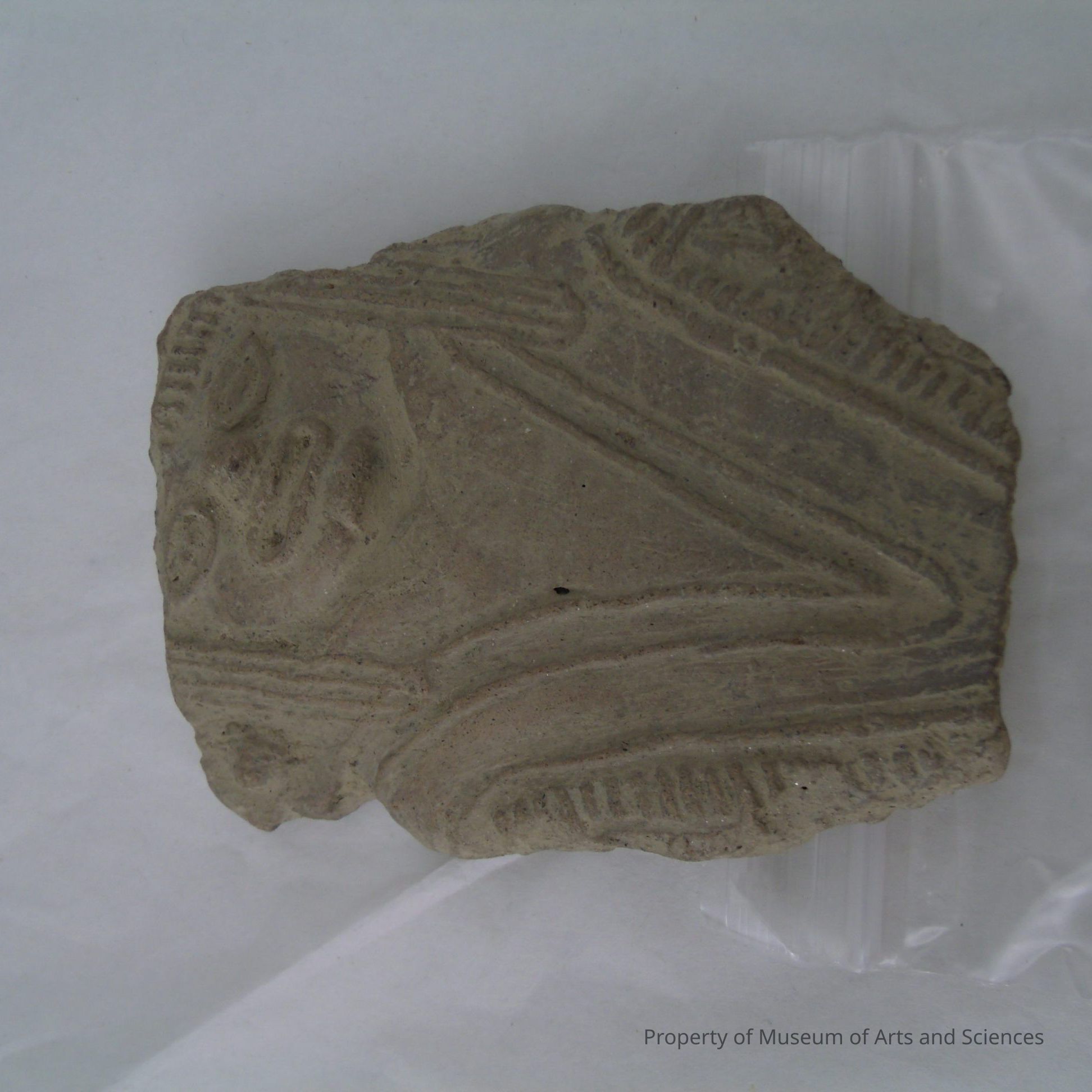 Beige pottery fragment, features hair and clothing in relief, light beige colorature, head and torso, no arms, right ear intact