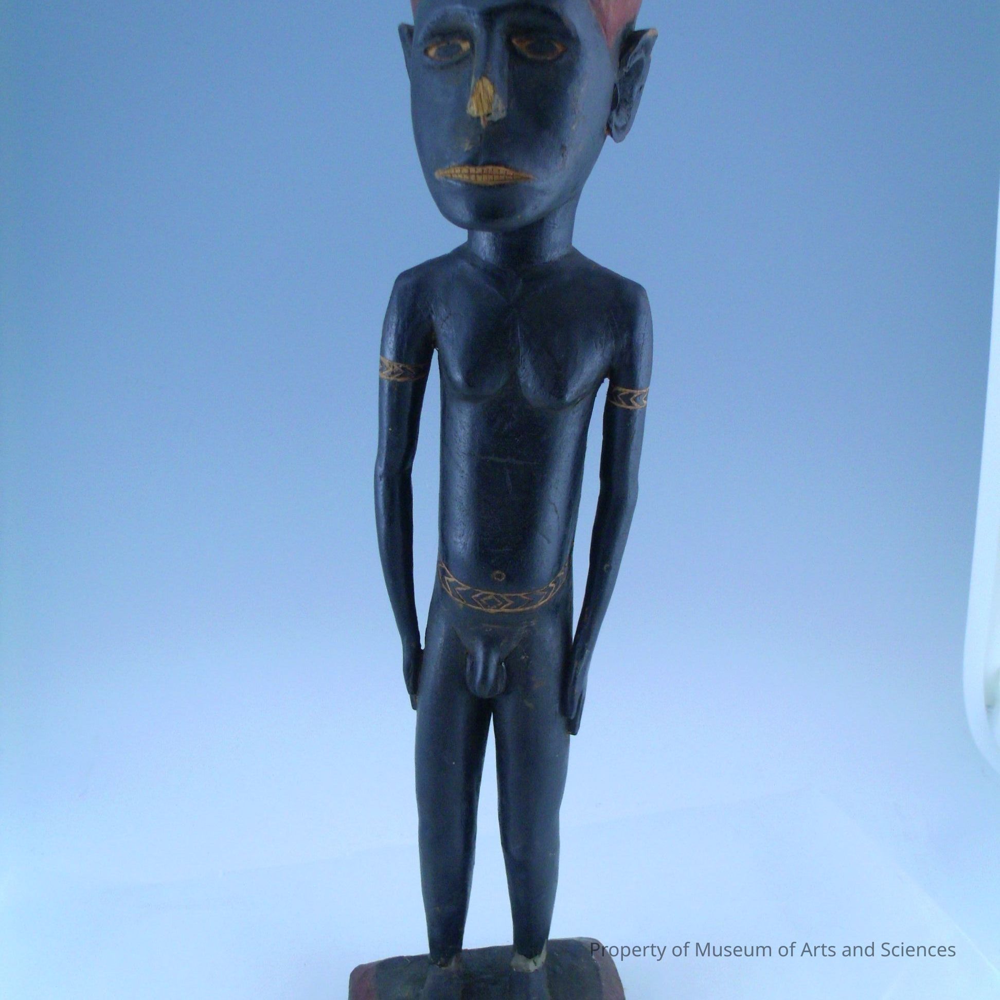 New guinean hood painted ebony, standing on base. Carved design around base, waiste and arms. Red headdress, stick through nose teeth showing.