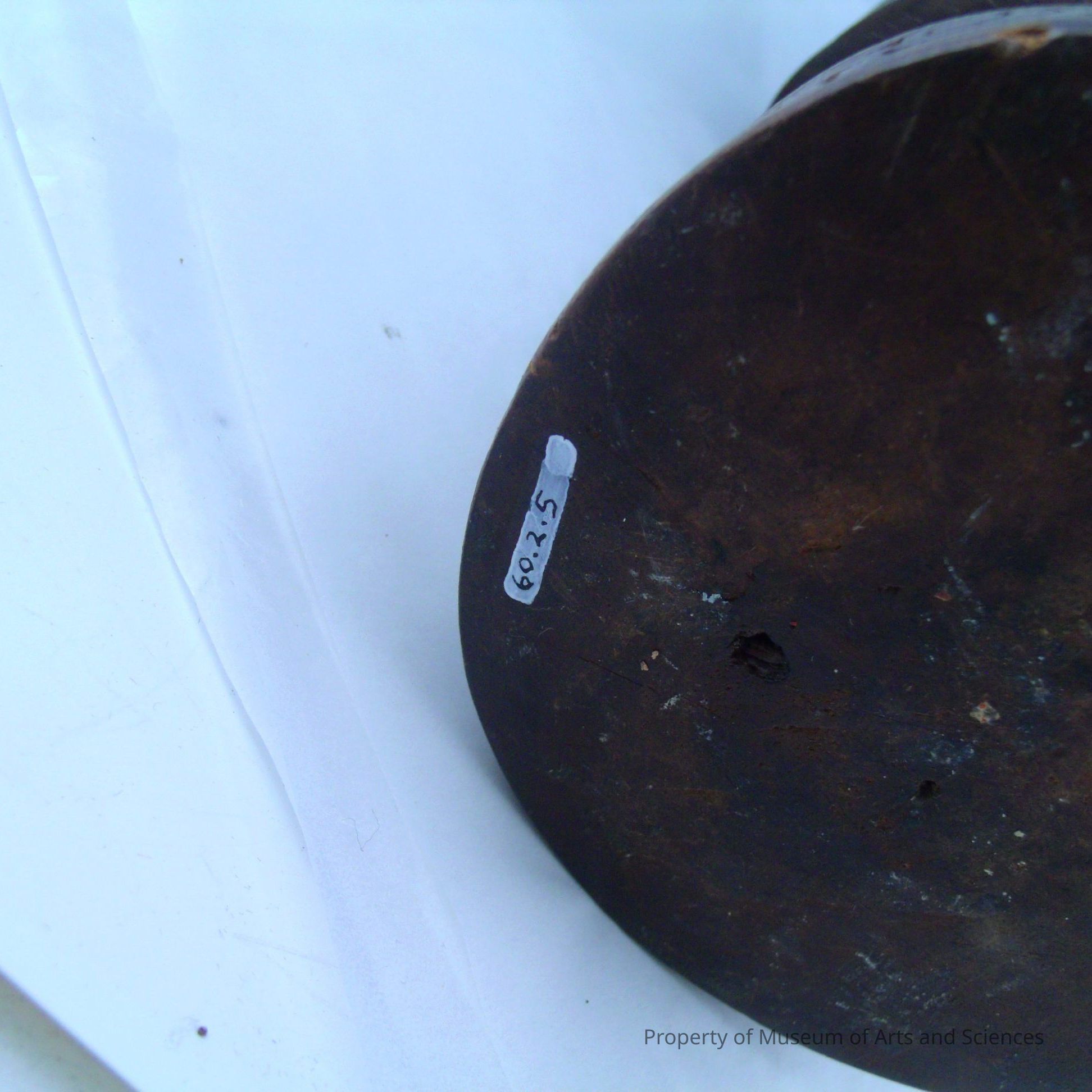 Seated figure holding bowl on head, elbows resting on knees, face held in hands. Seated on base. Design on base legs, arms, and bowl carved in the wood. Rich BrownCollection