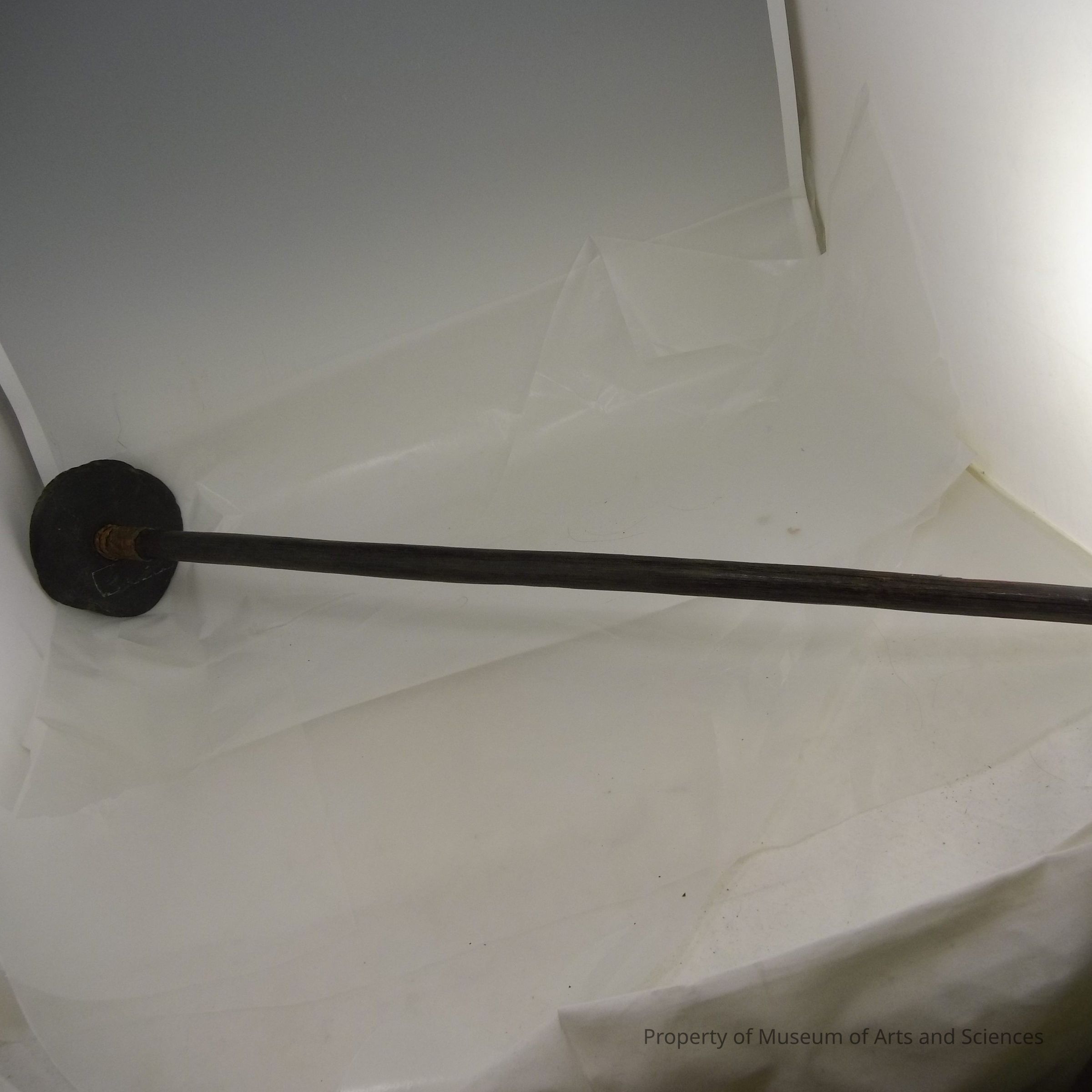 Dark Brown wood painted at one endwith rattau binding at top, round slate disc about 3" from top