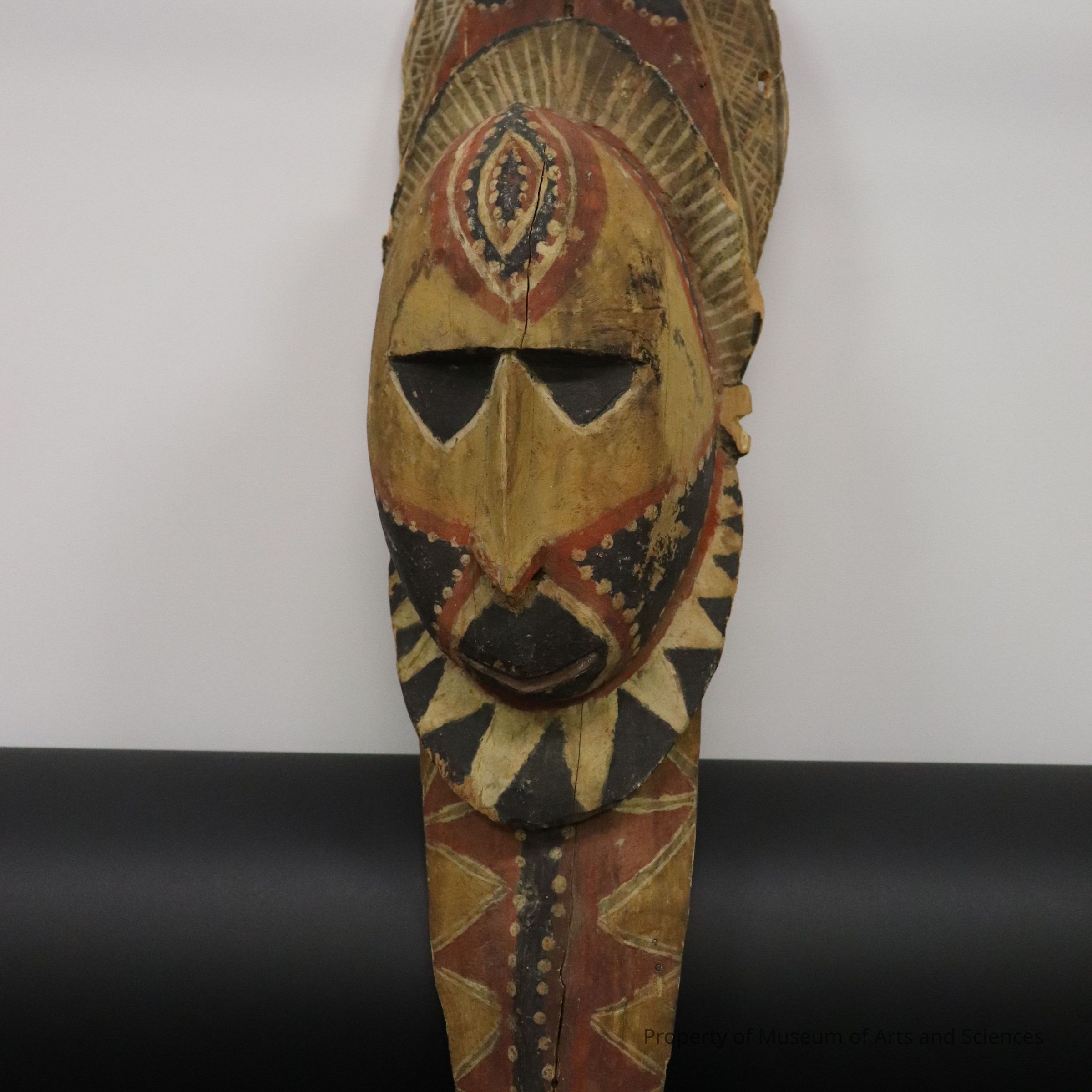 Wooden head on long oval plaque-painted and strung through nose and ears, paint colors mainly yellow, and black, flat on backsideback