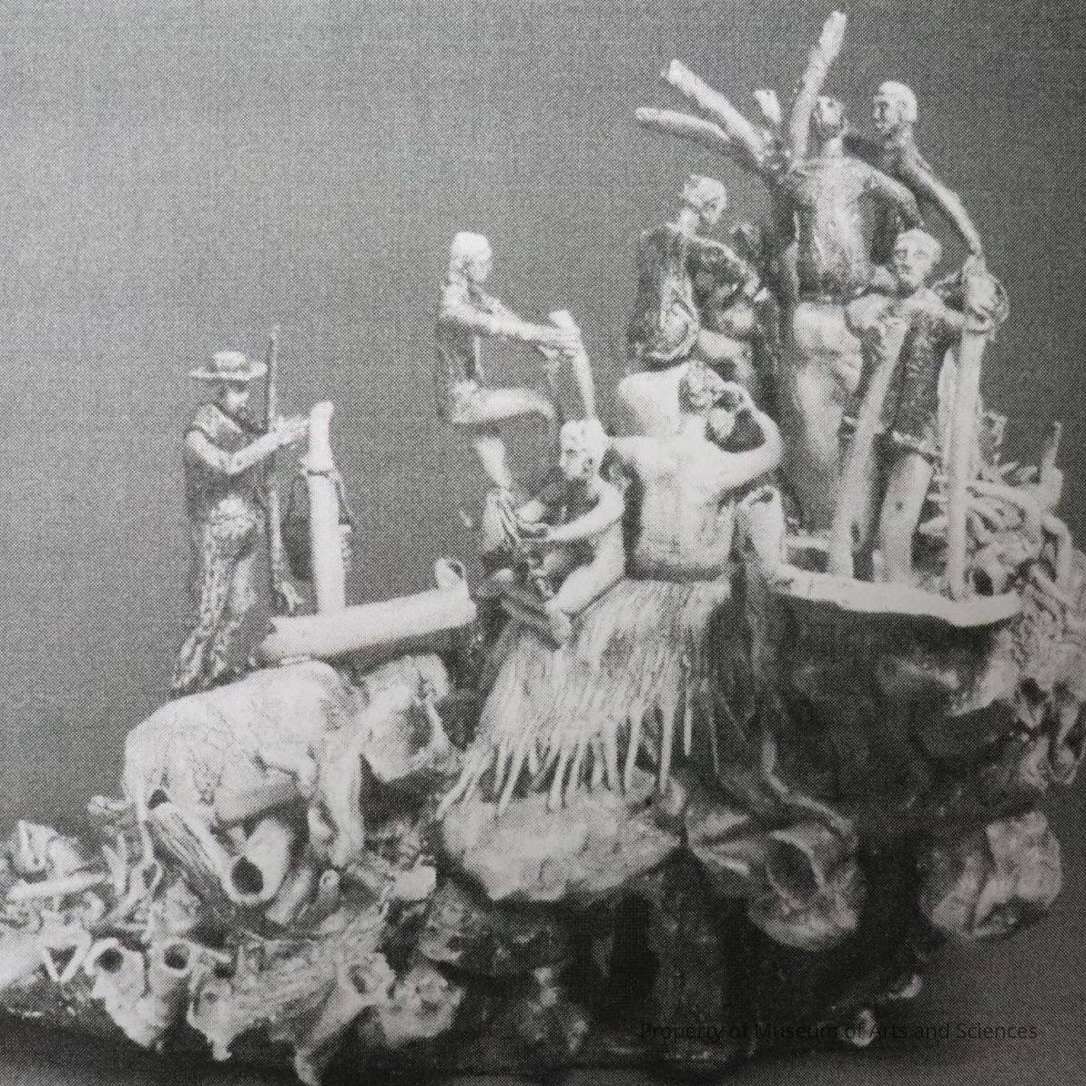 Clay sculpture. Many figures in a landscape possibly depicting a past flood in the town of Miramichi, Canada?