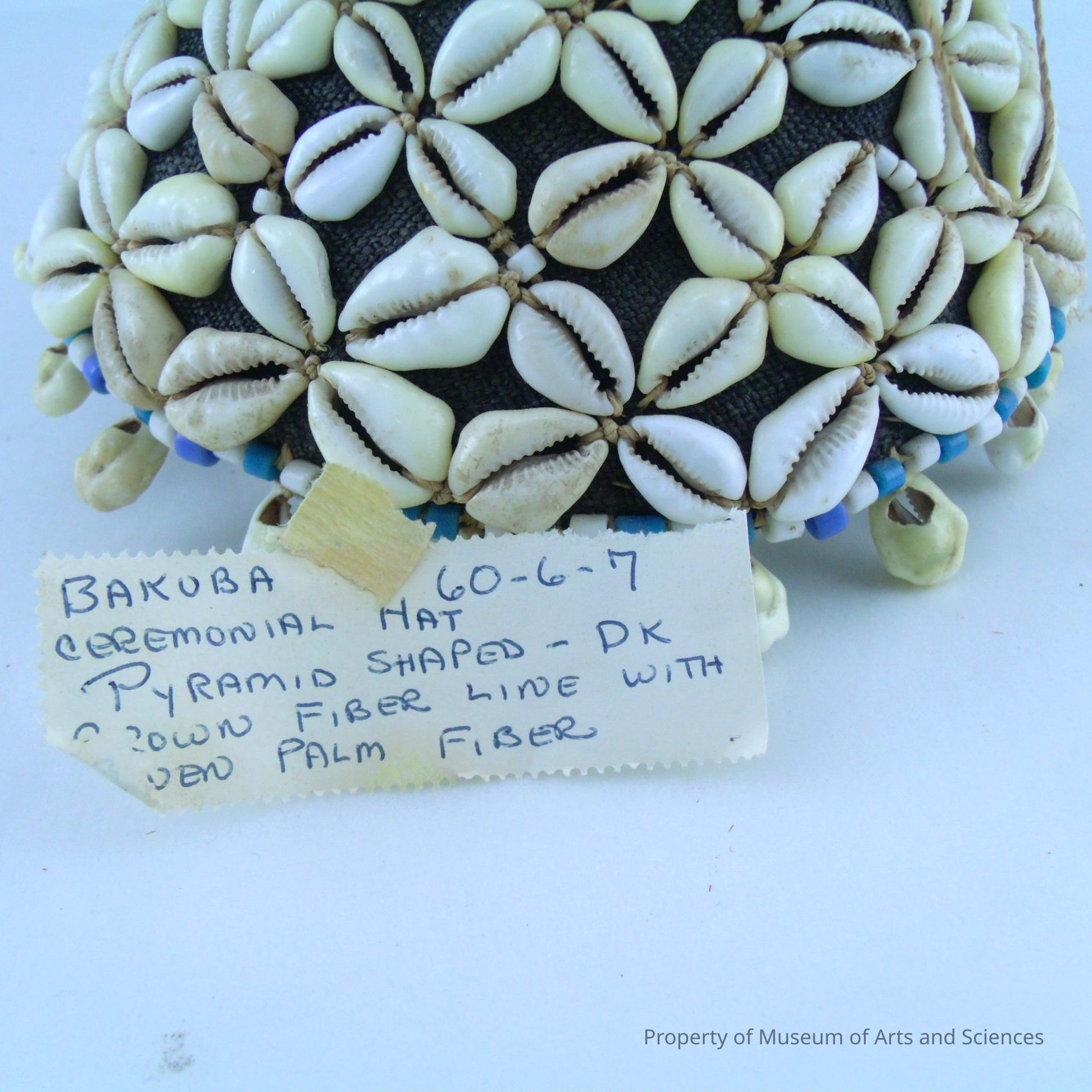 Ceremonial pyramid of dark brown fiber decorated with white shells, black and white beads lined with woven palm fiber (bakuba)