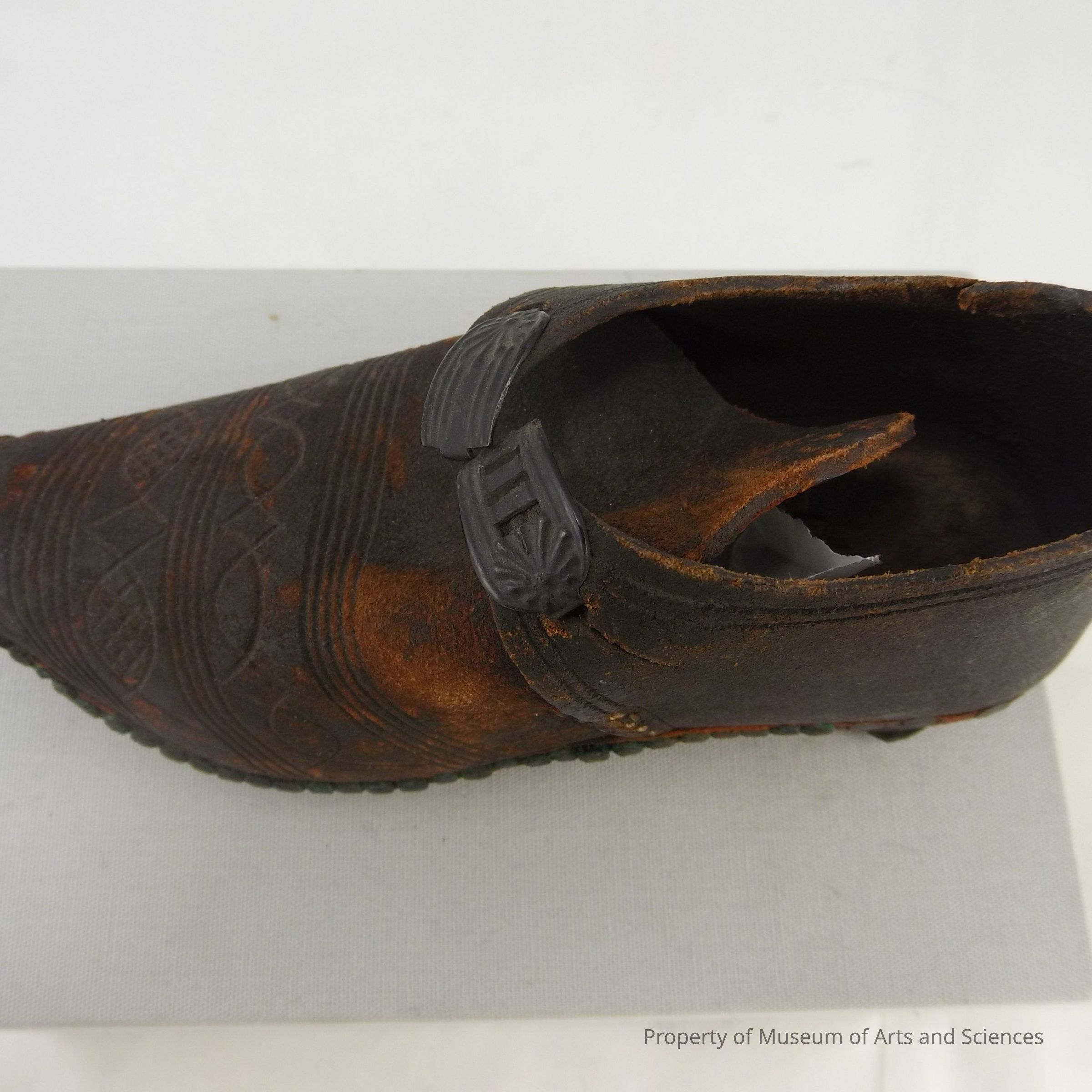 very small, hard leather with tooled design, wooden shoes 2 different pairs: one buckled; one tied; children's shoes made during WWII in England- had wooden soles because England could not get leather during the war; 2 pair given (see newspaper article)Collection