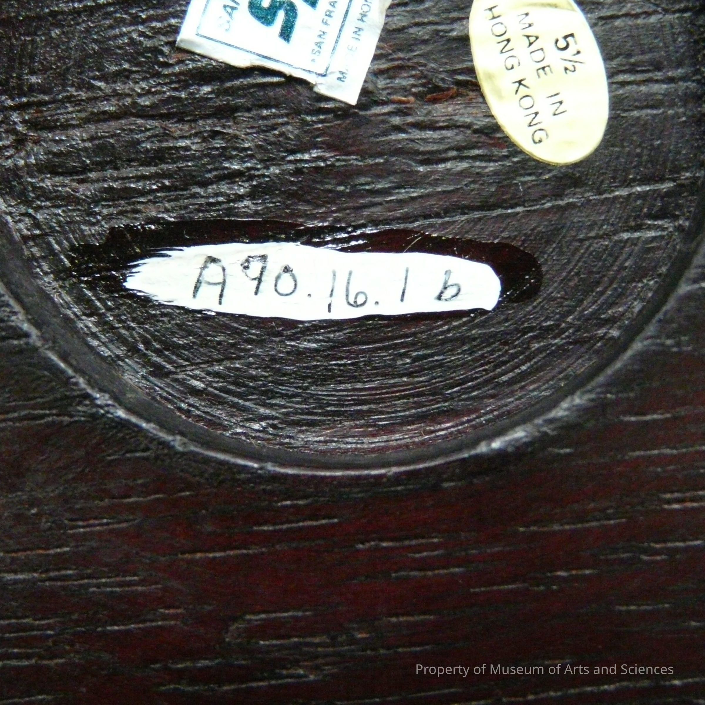 White clay body with underglaze coloration and colored glazes blue green, orange coloration, C. Sibley (side bottom). Wooden stands for each marked A90.16.1a,b respectively.Collection