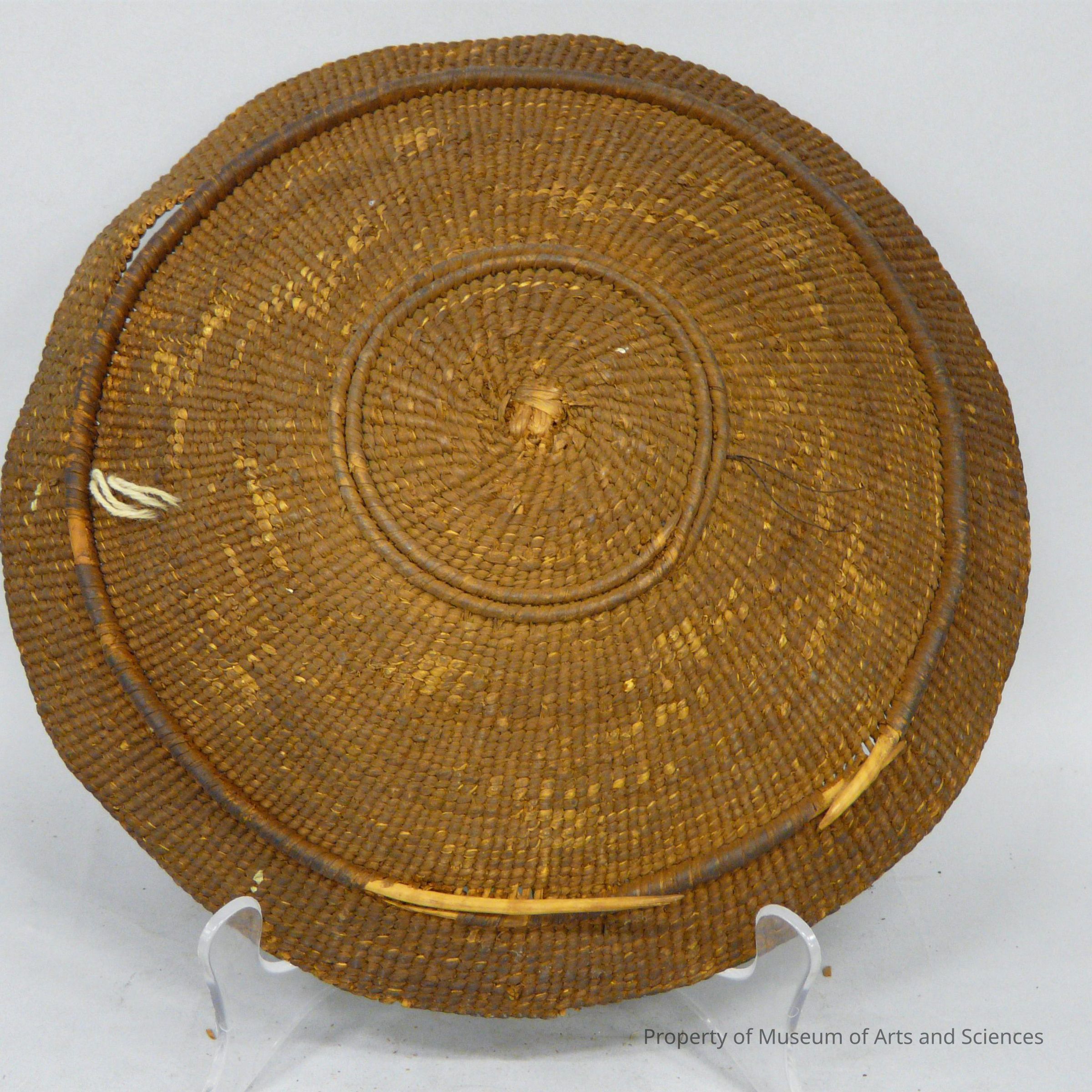 This basket has a wide shallow shape. This type of shallow circular basket was used for serving food. The basket is constructed of tule and dyed tule cordage in contrasting shades of brown in a geometric design.Collection