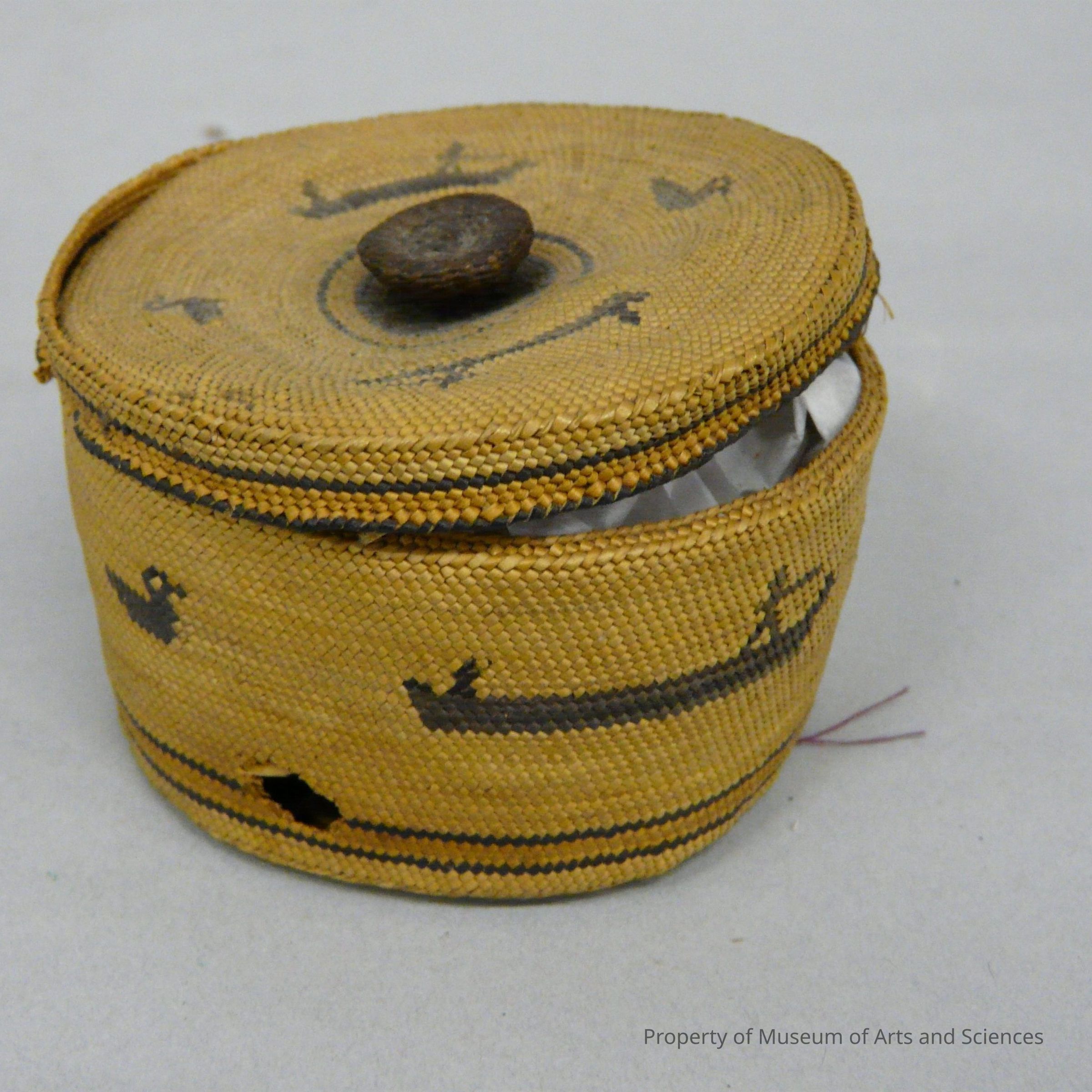 This circular basket with a lid has a base that is composed of basket-weave reeds surmounted by fine grass weaving of the sides and lid. The basket is light brown with a dark brown design of two men in a long canoe hunting two ducks.Collection