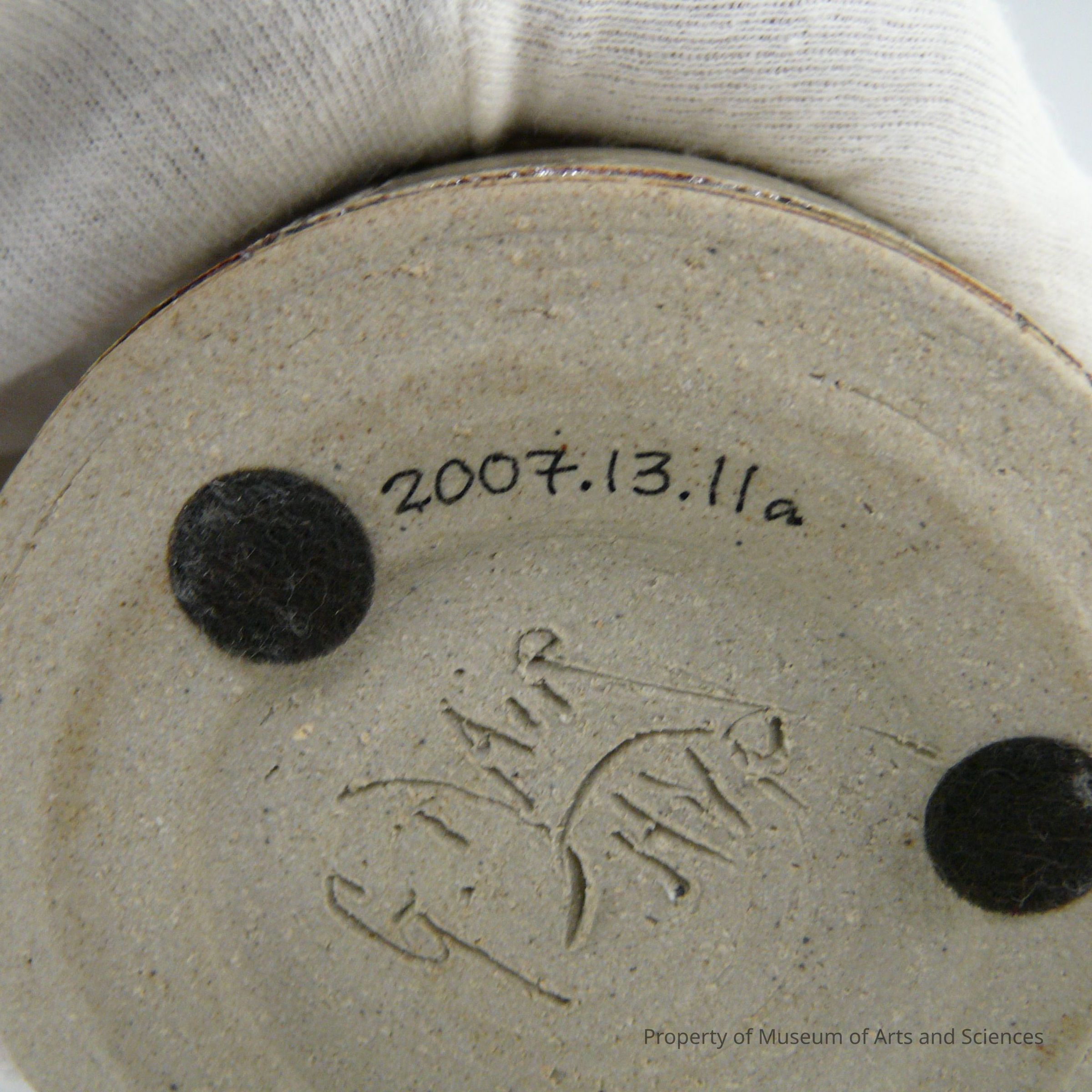 Round container with decorative lid; art drawn into clay on front and back is suggestive of a tree within a circle; tree is glazed white; Lid's handle is a formed piece of clay which suggests a bowing figure on knees with head toCollection