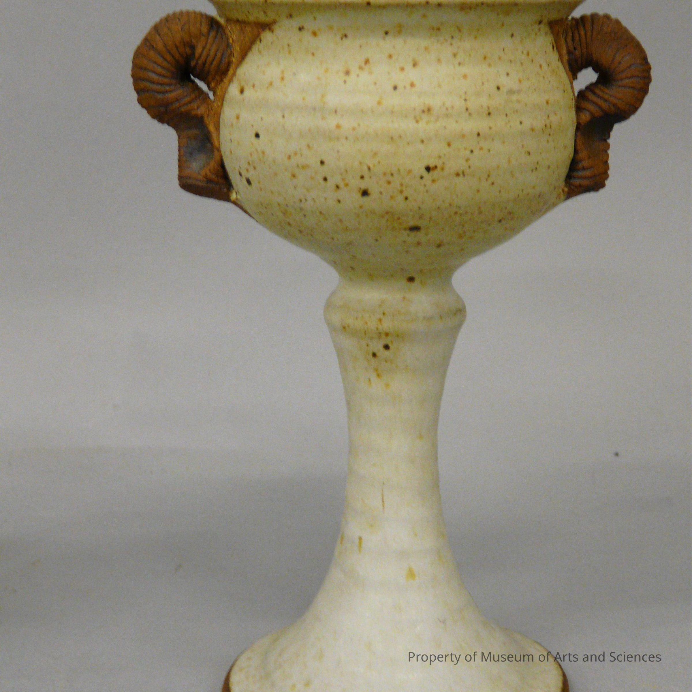 Signature: KT simple design goblet glazed light tan with darker brown handles on either side made of striated "fingers" of clay which resembled fat caterpillars
