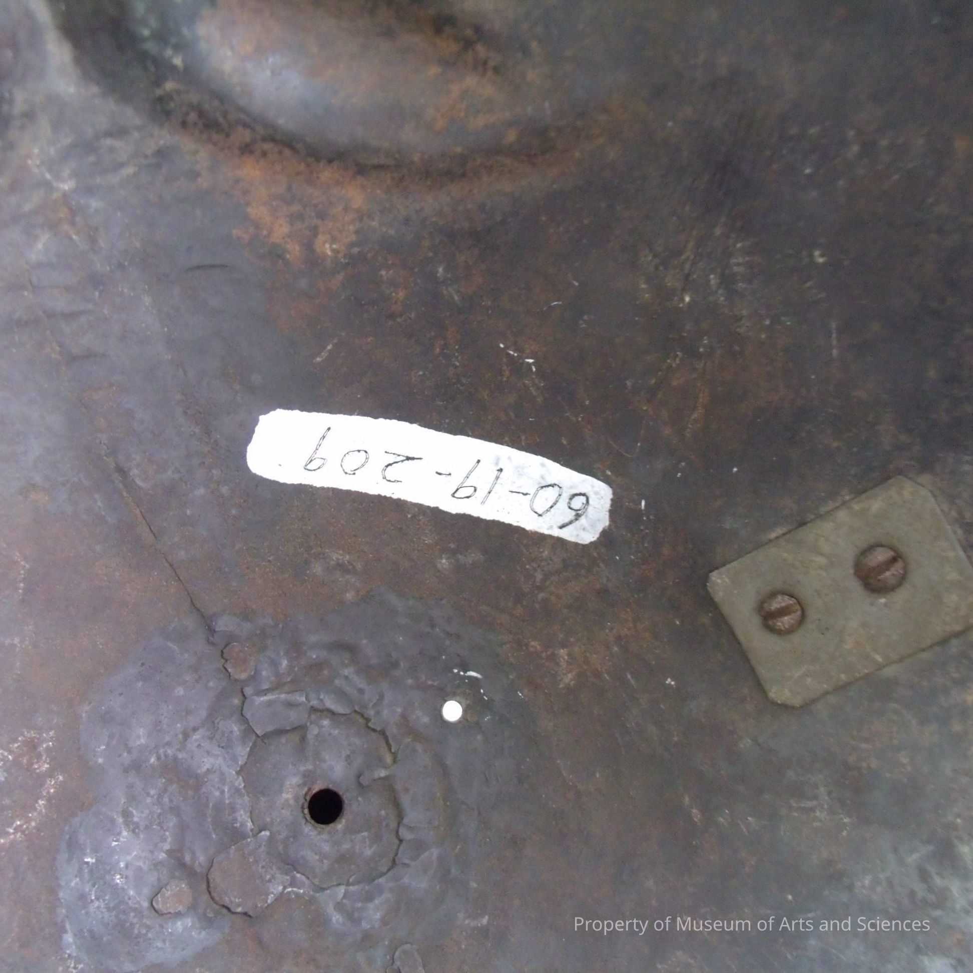 Hammered iron, probably from Phillipines; horns, eyes, nose Fringe of chain mail Cataloged by L.L.12/2/60