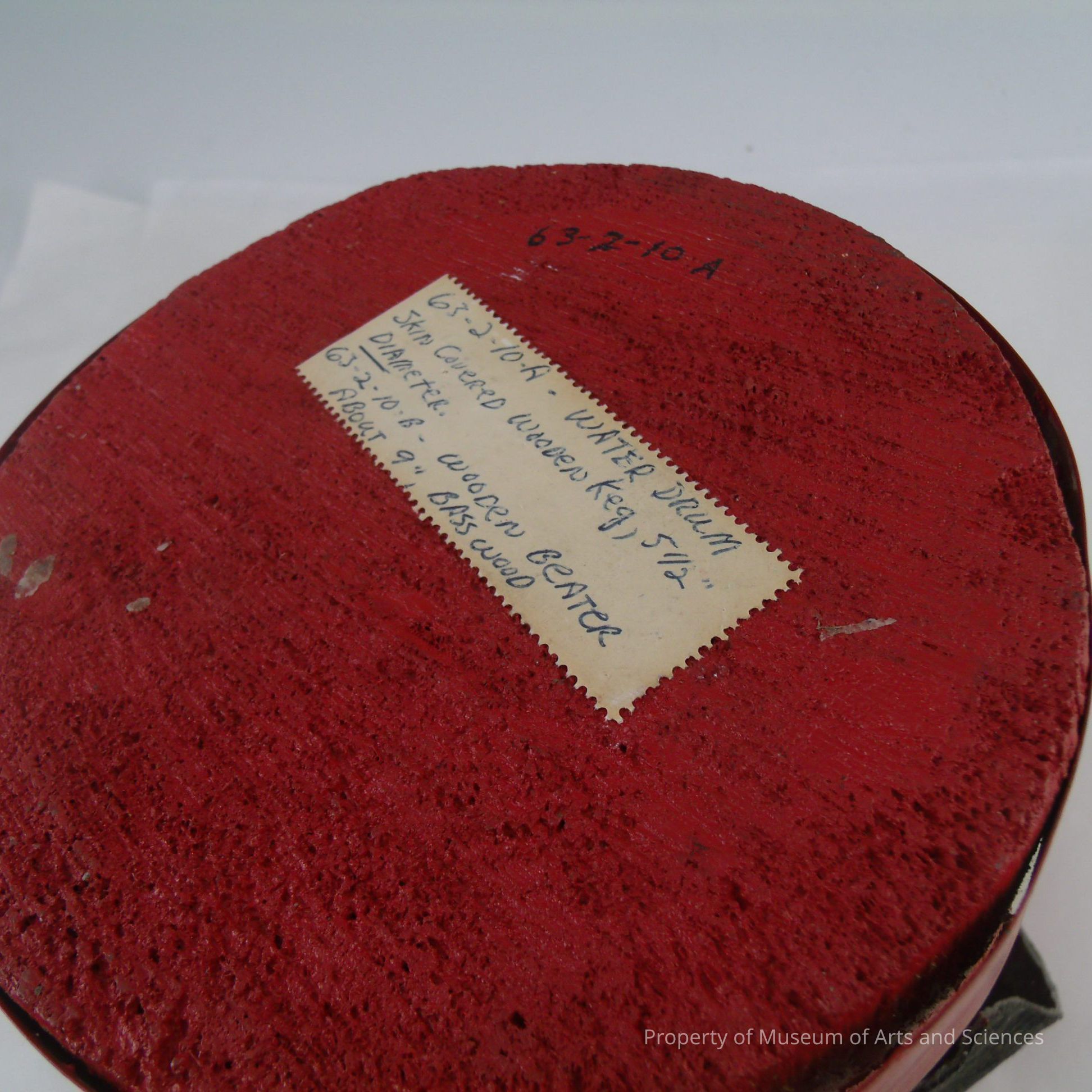 (a) Skin covered wooden keg 5.5" in diameter (b) wooden beater Bass wood (missing)
