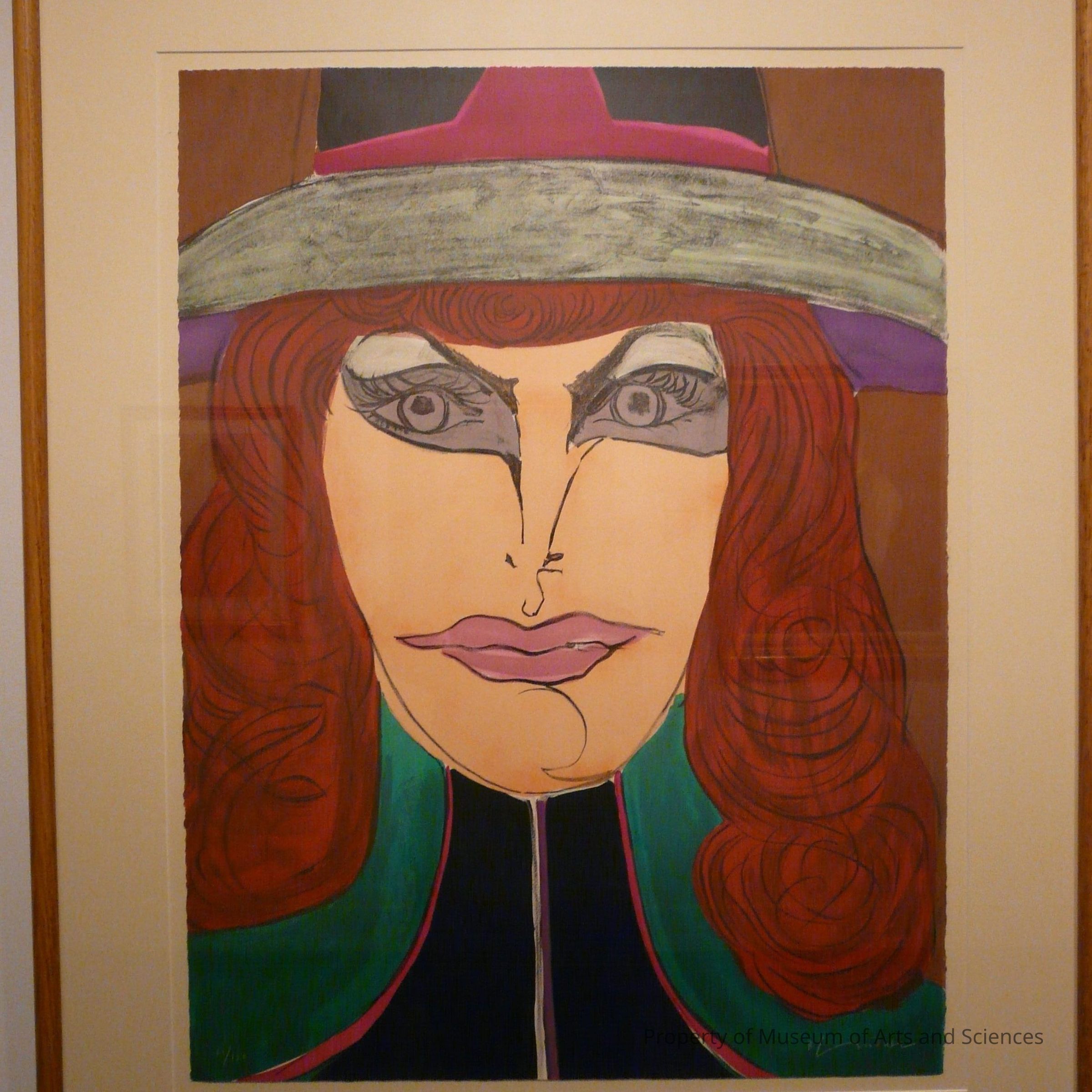 Frontal view of woman's head and neck with hat visible at top. Strong, darkened eyes and bold mouth with long red hair and disburbing countenance. Wears green and black high necked sweater with pink pipingArtwork Details