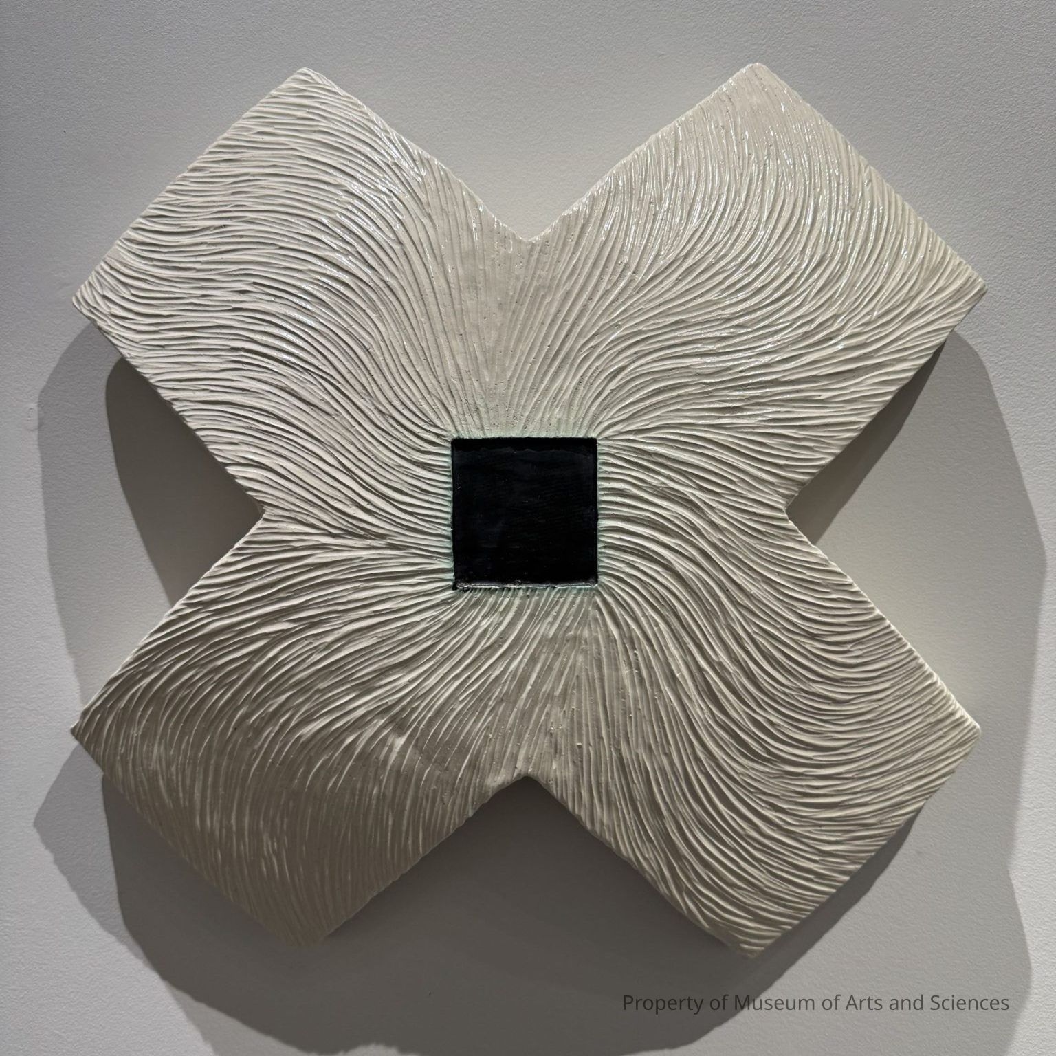 White ceramic X with carved lines radiating from the center black square