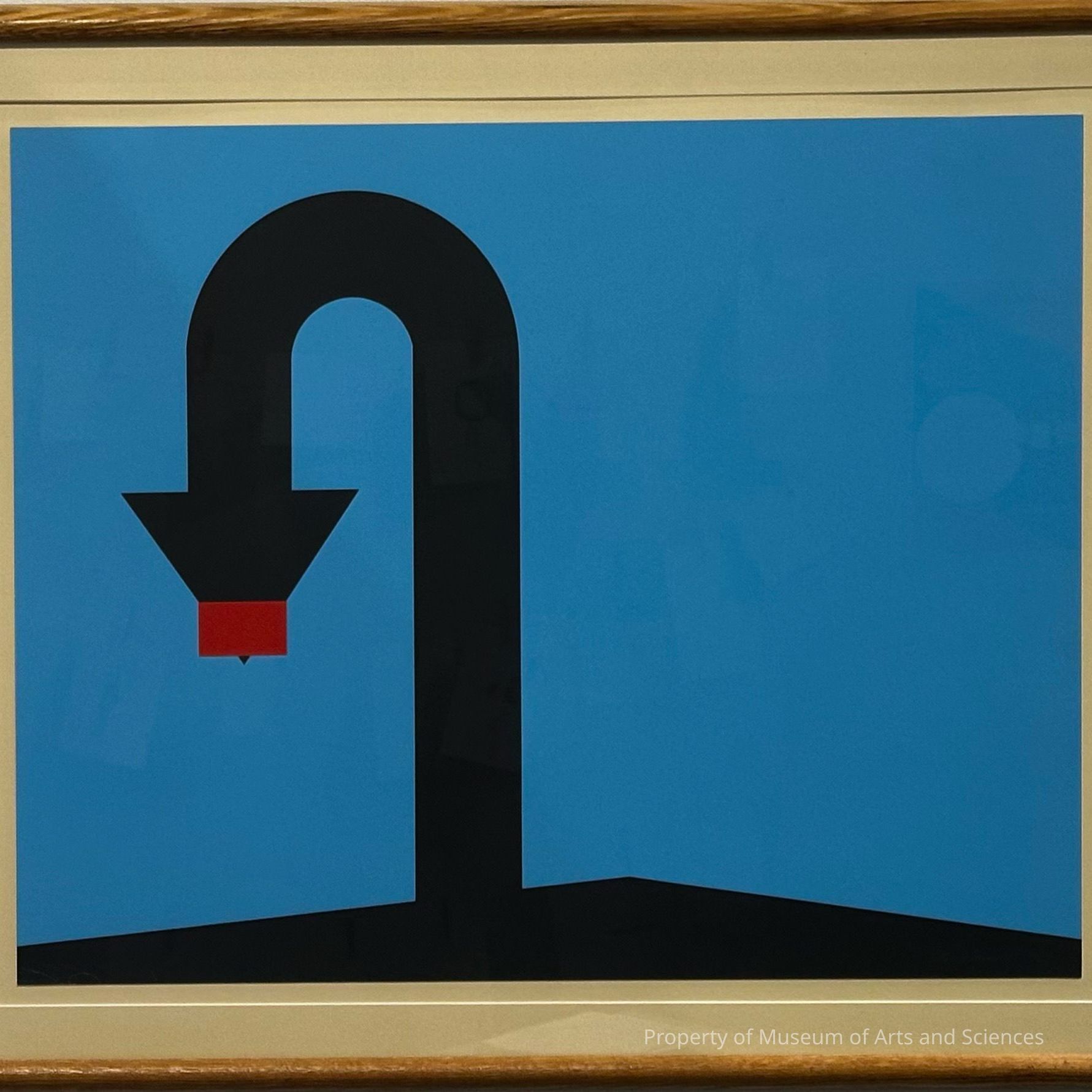 A low isosceles triangle, black across base with arrow shaped figure, tall, bending around and down to left of center. Small red rectangle over point of arrow. Against medium blue background.Artwork Details