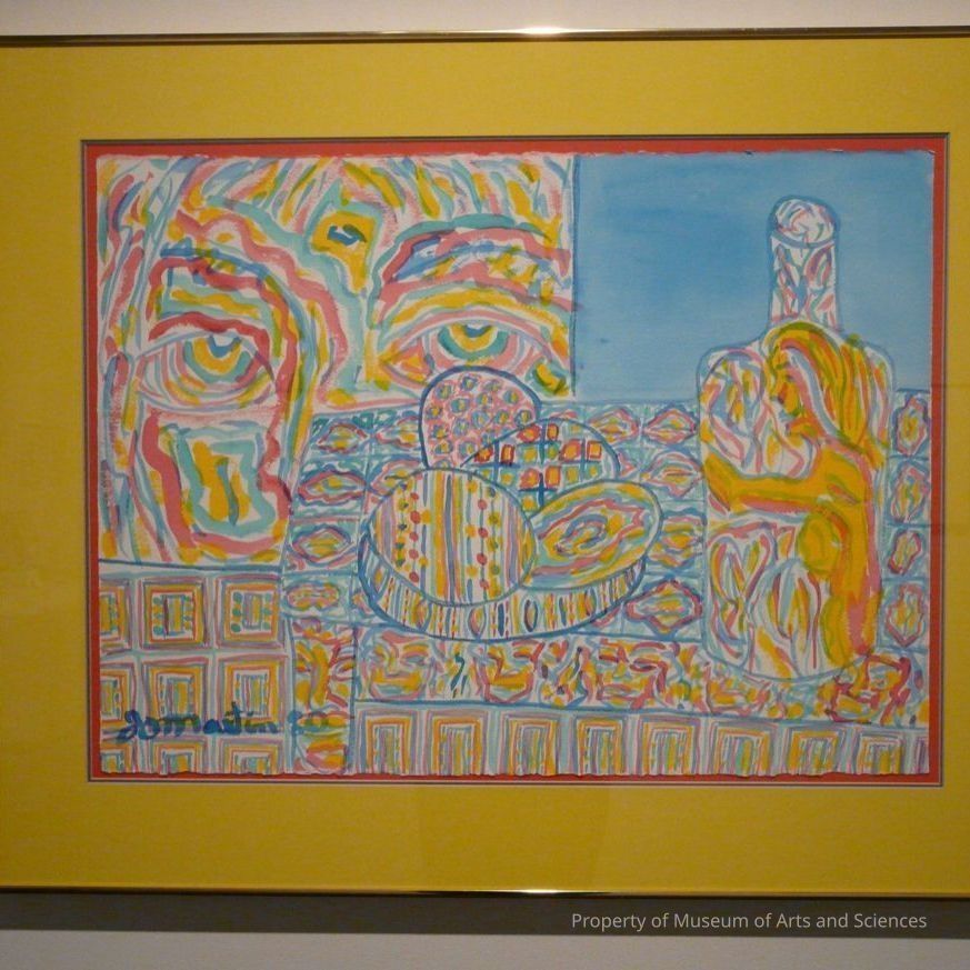 This work is representative of Dr. Martin's work. He was an ophthalmologist and prolific painter. This shows a father's close eye on eggs and a bottle representative of his wife and children in bright yellows and pinks.