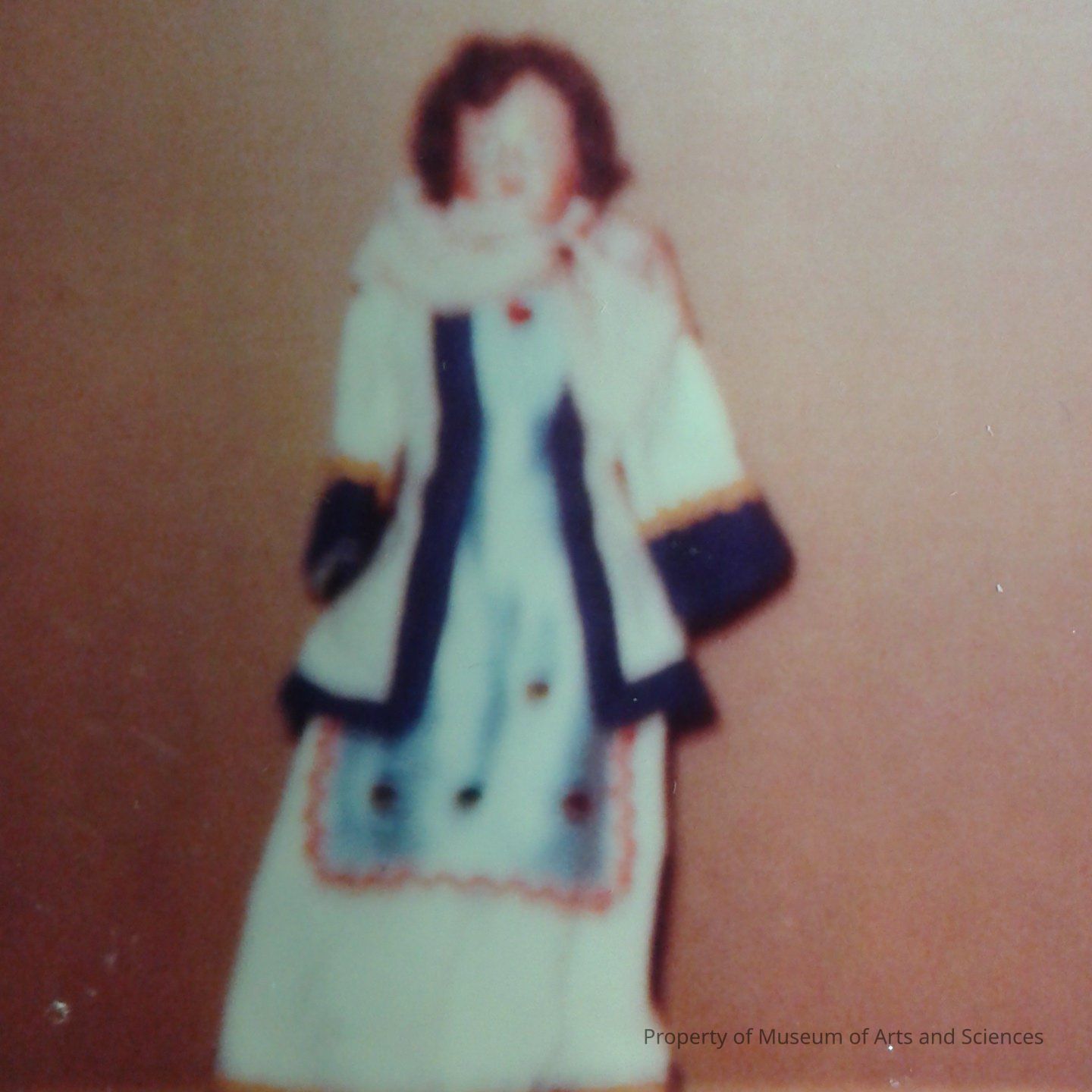 This figure wears an off shirt trimmed at the bottom with a thick band of blue. The top of which is a row of glod nick- nack? She wears a light blue blouse with one red (?) in the center. She wears an apron of the same light blue material trimmed on the edge with coral (?) and decorated on the front with 2 red, 2 gold, and 1 green sequin. The jacket is a off white trimmed in blue on the edges.Collection