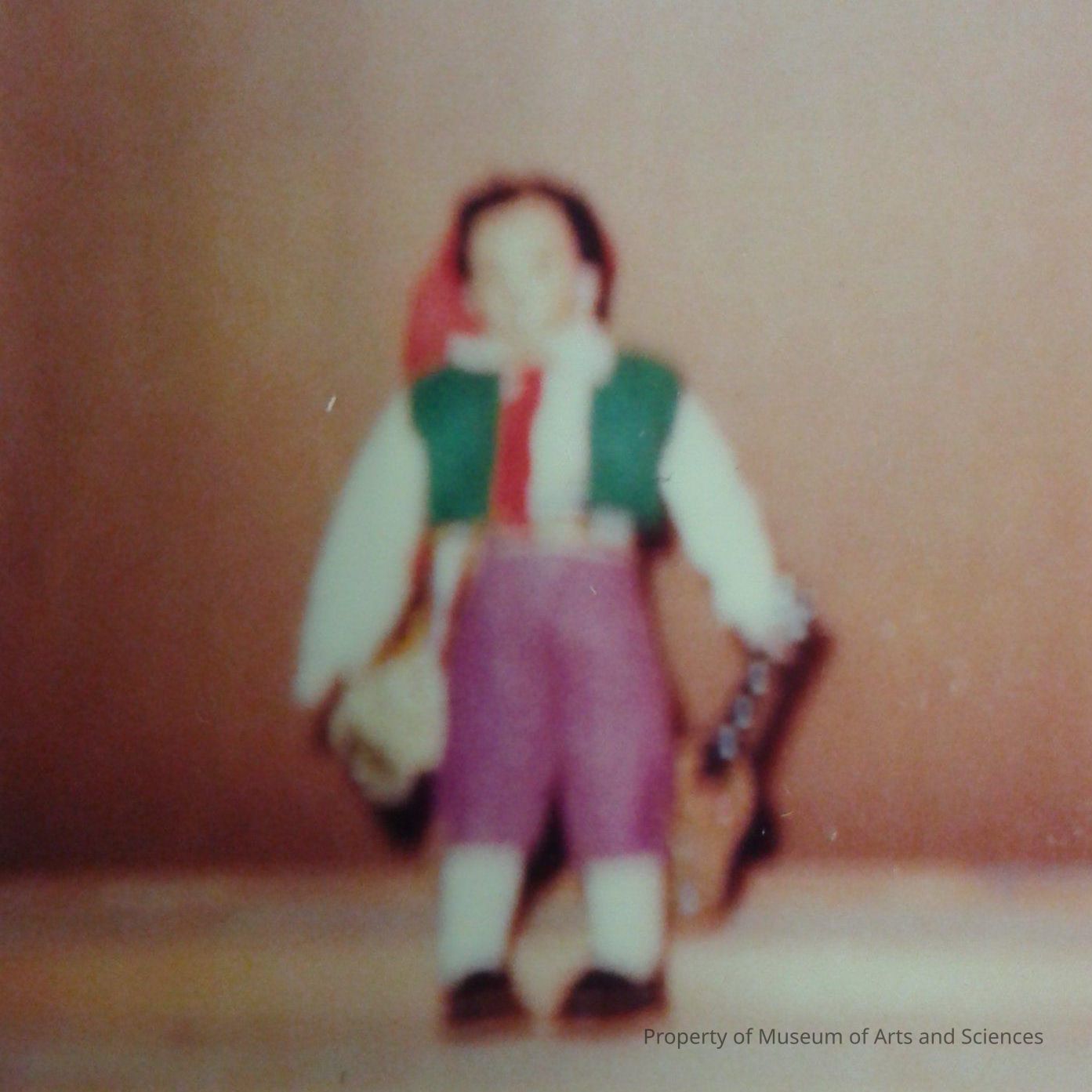 The doll has painted features on his face. His hair is a short cropped material on which he wears a red felt hat from which red yarn tassle falls. His arms and legs are fabric that have been stuffed. The shirt is a cream cotton long sleeved one with green felt vest over it. A red ribbon formes the necktie and a plaid ribbon is tied at the waist. The knee pants are a purple felt. He is wearing white knit stockings and black leather slippers.Artwork Details