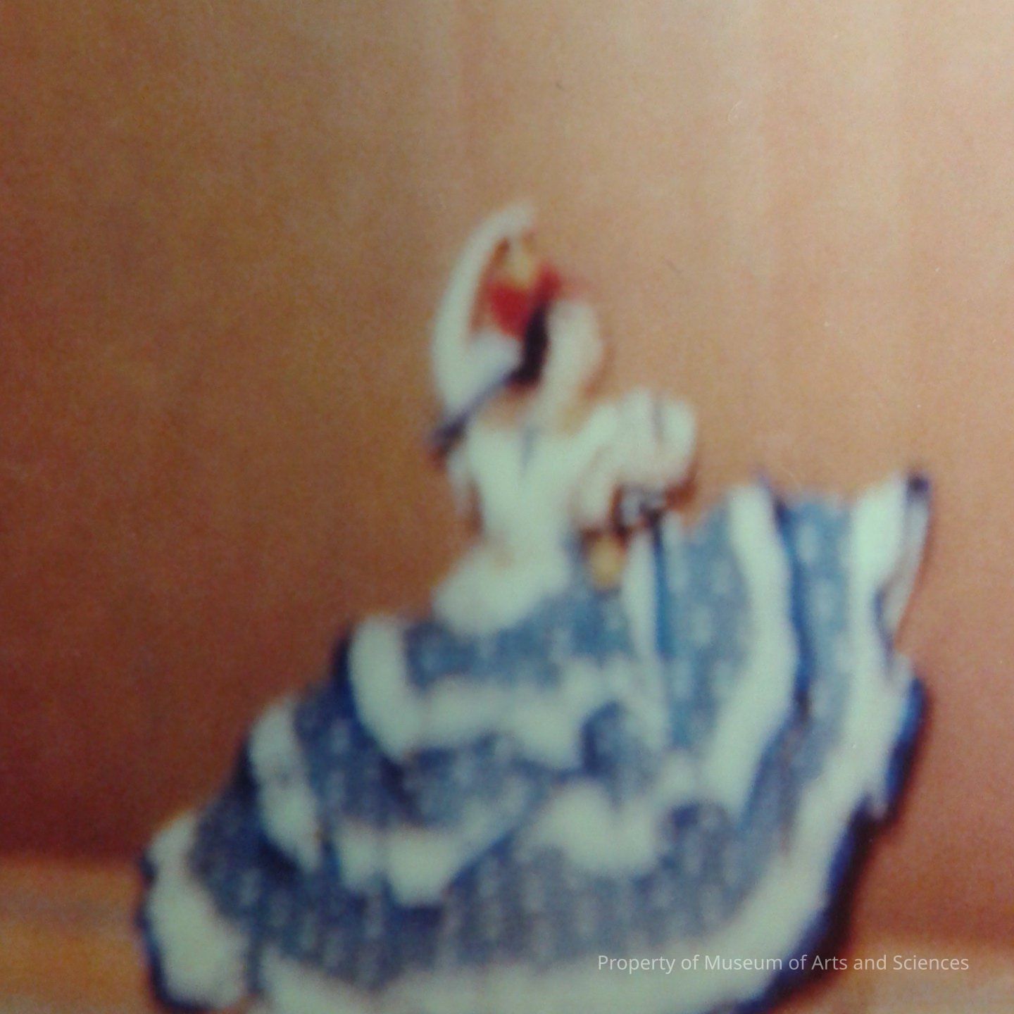 She has short white ruffled sleeves. And her shawl is a white patterned fabric. the castanettes are made of tiny yellow and red balls. Her body is posied as if she were dancing.Artwork Details