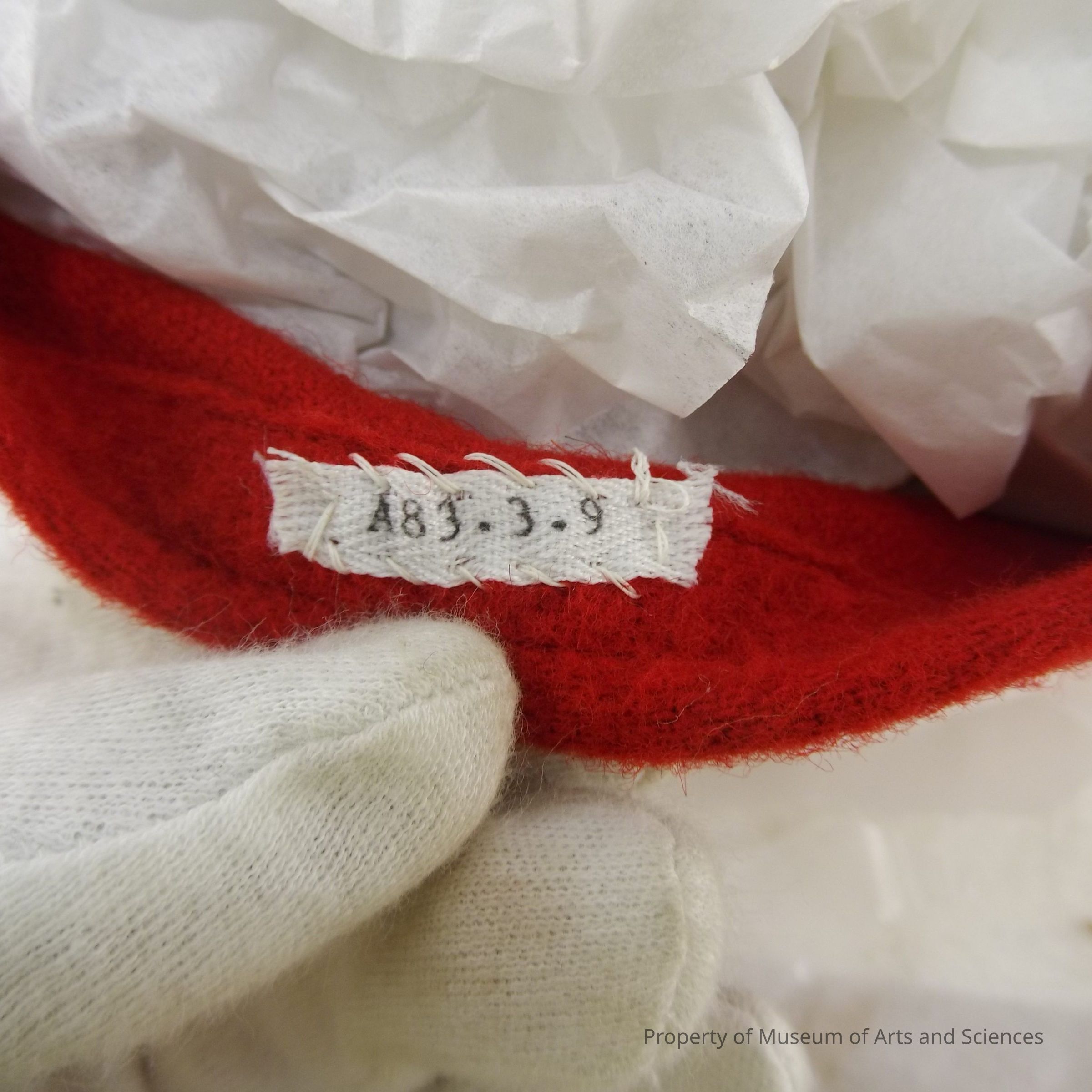 Red wool fabric hat worn by palace guards in Athens, Greece. See the small replica of soldiers in uniform in the Orr collection. Black tassel hangs grom button on top. A gold pin in the shape of a crown is pinned on the side. Skull cap appearance.Artwork Details