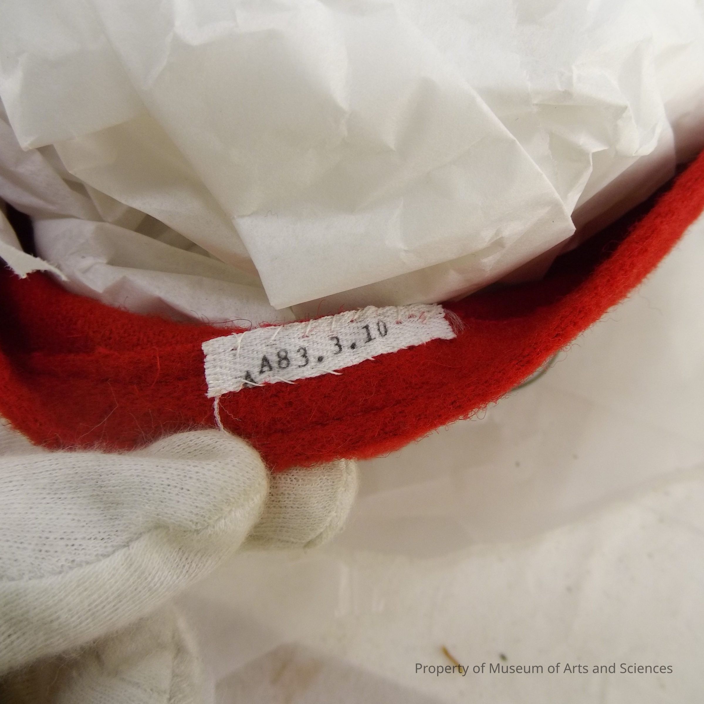 Red wool fabric hat worn by palace guards in Athens, Greece. See the small replica of soldiers in uniform in the Orr collection. Black tassel hangs grom button on top. A gold pin in the shape of a crown is pinned on the side. Skull cap appearance.