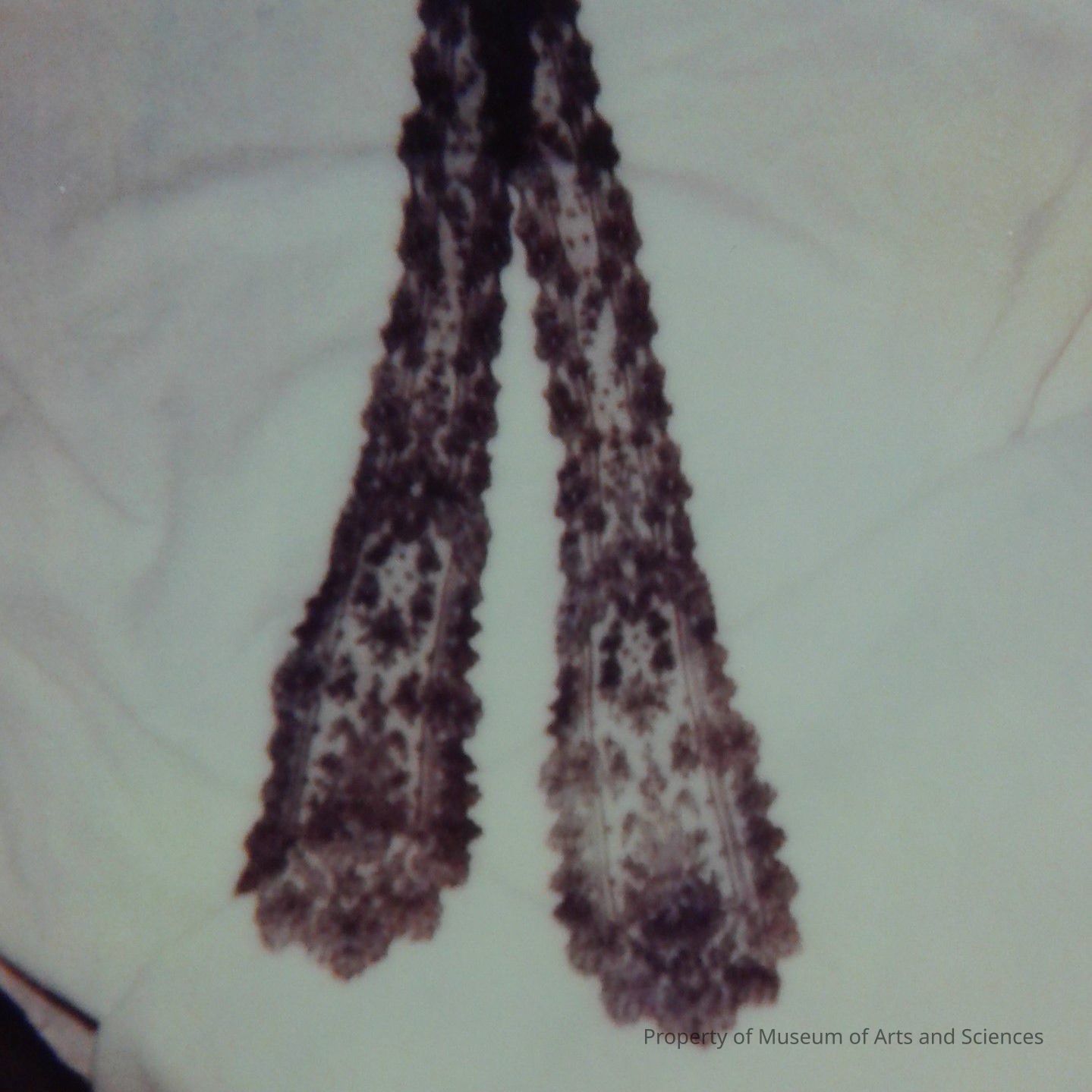 A delicate black lace Jabot. the lace pattern is comprised of flowers (daises) leaves, and scroll like shapes. The flowers and leaves form a scalloped effect on the edges.Collection