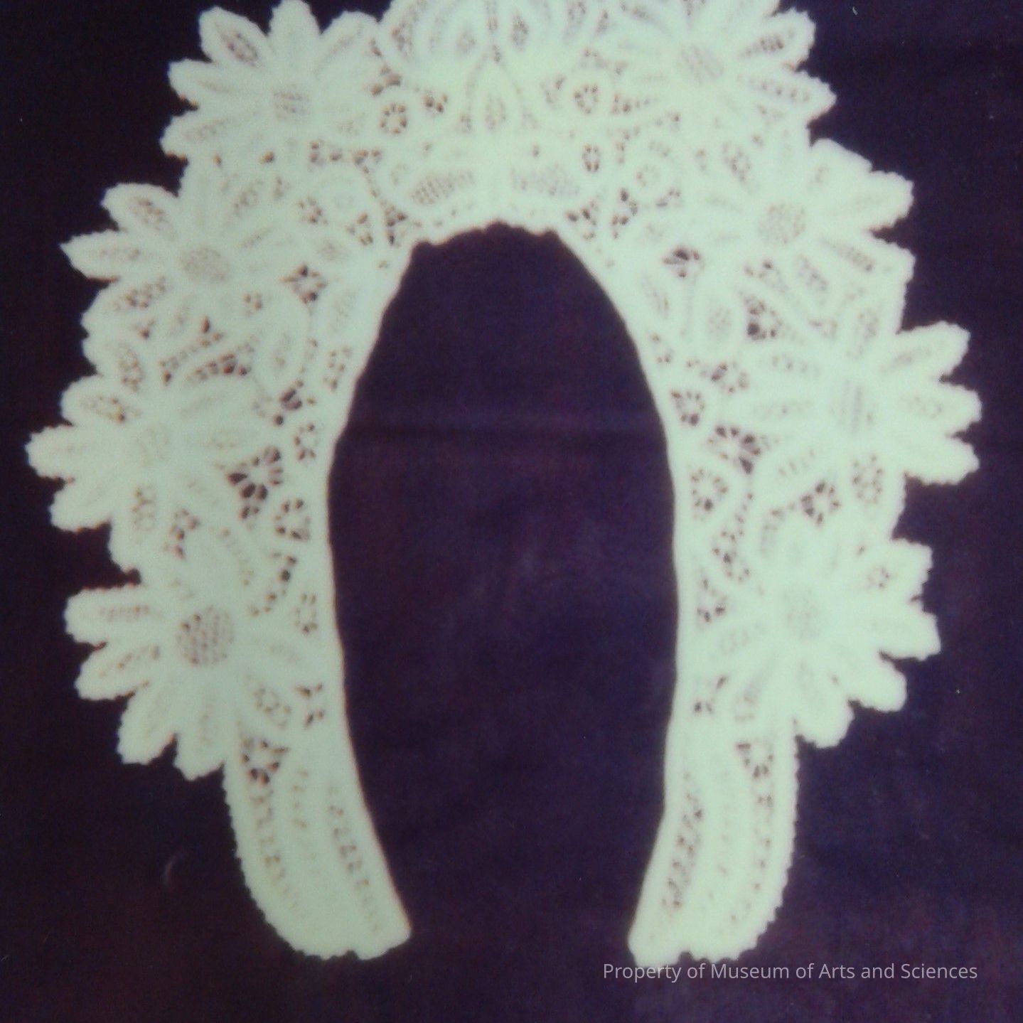 Cream colored battenburg lace bertha collar. Thin lace strips are laid out in an asymmetrical floral and geometric pattern. They are woven together by a wide variation of embroidery stitches. Also pulled thread techniques have been used to create pattern. The collar would lie flat on the dress wider in the back and coming together in a point in back the floral petals give the outer edge a scalloped effect.Artwork Details