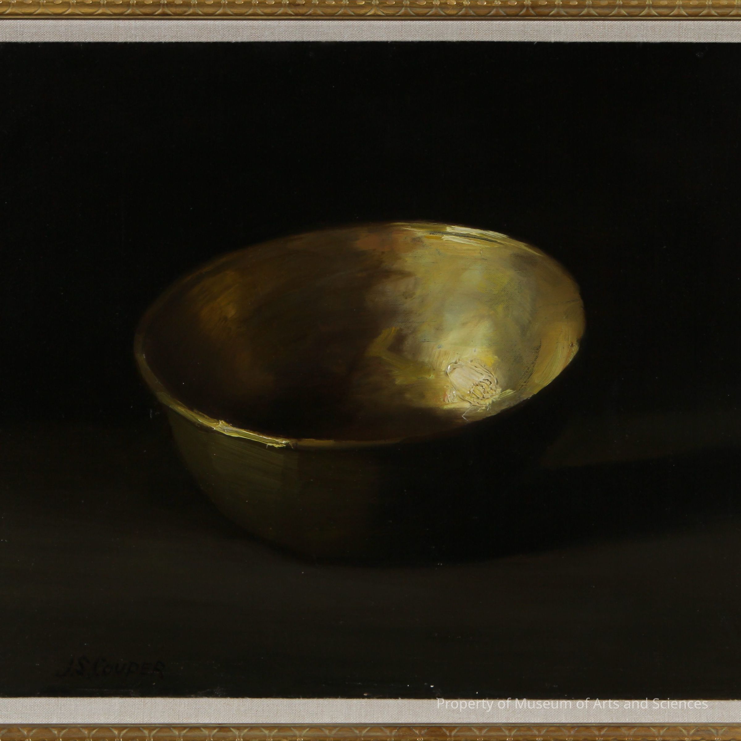 Rounded brass bowl in table with glowing bright light spot to right. Very true execution.Collection