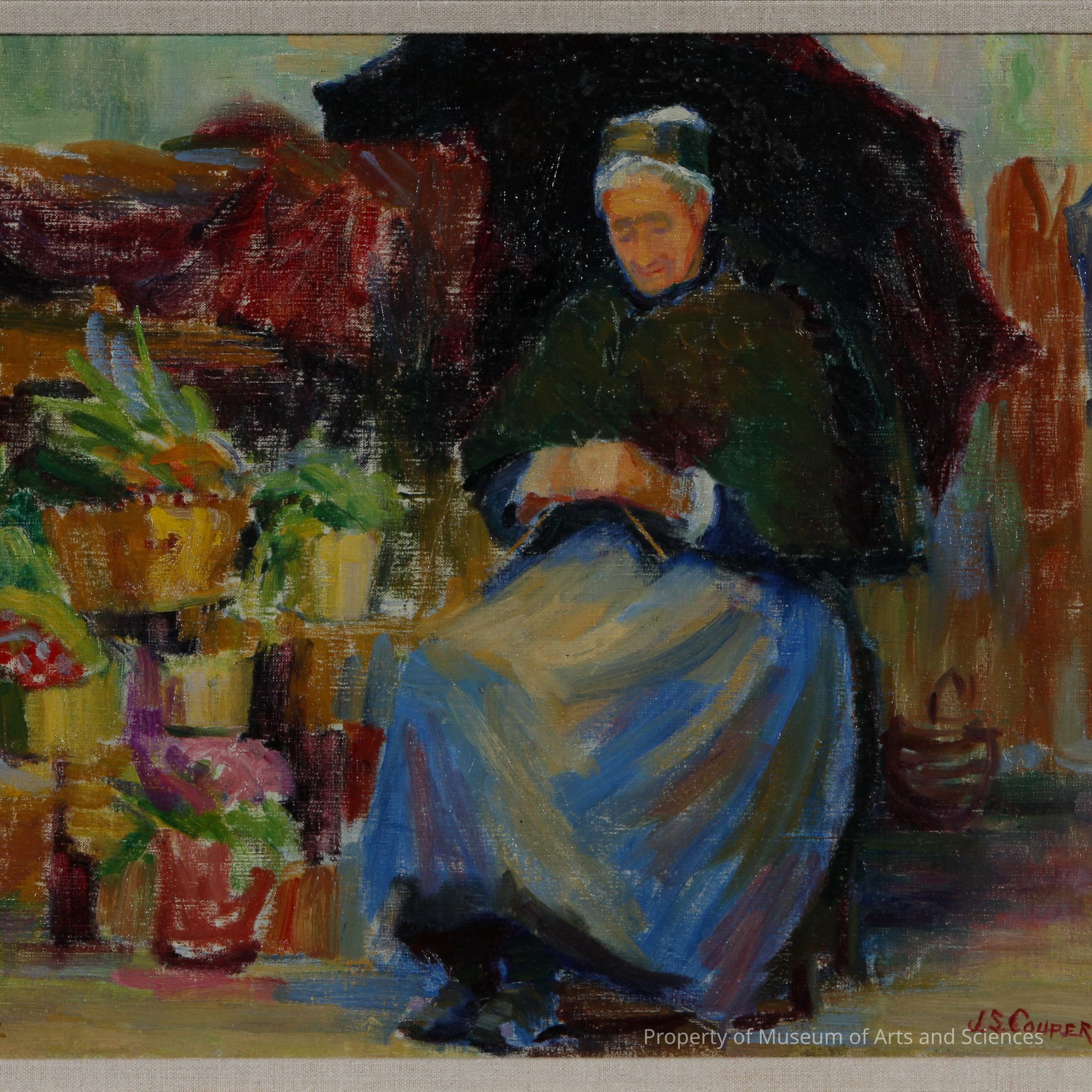 Women under a large umberlla by a vegatable stand- she is knitting. Brightly colored.Artwork Details