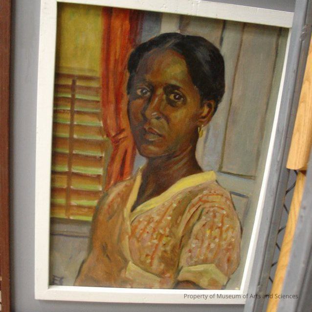 This is a portrait of Maud, Shorter's housekeeper. It is a 3/4 vie of an African American woman with her hair tied back, revealing her ears. She wears a yellow and red short sleeved dress and sits in front of a window with wood blinds.Collection