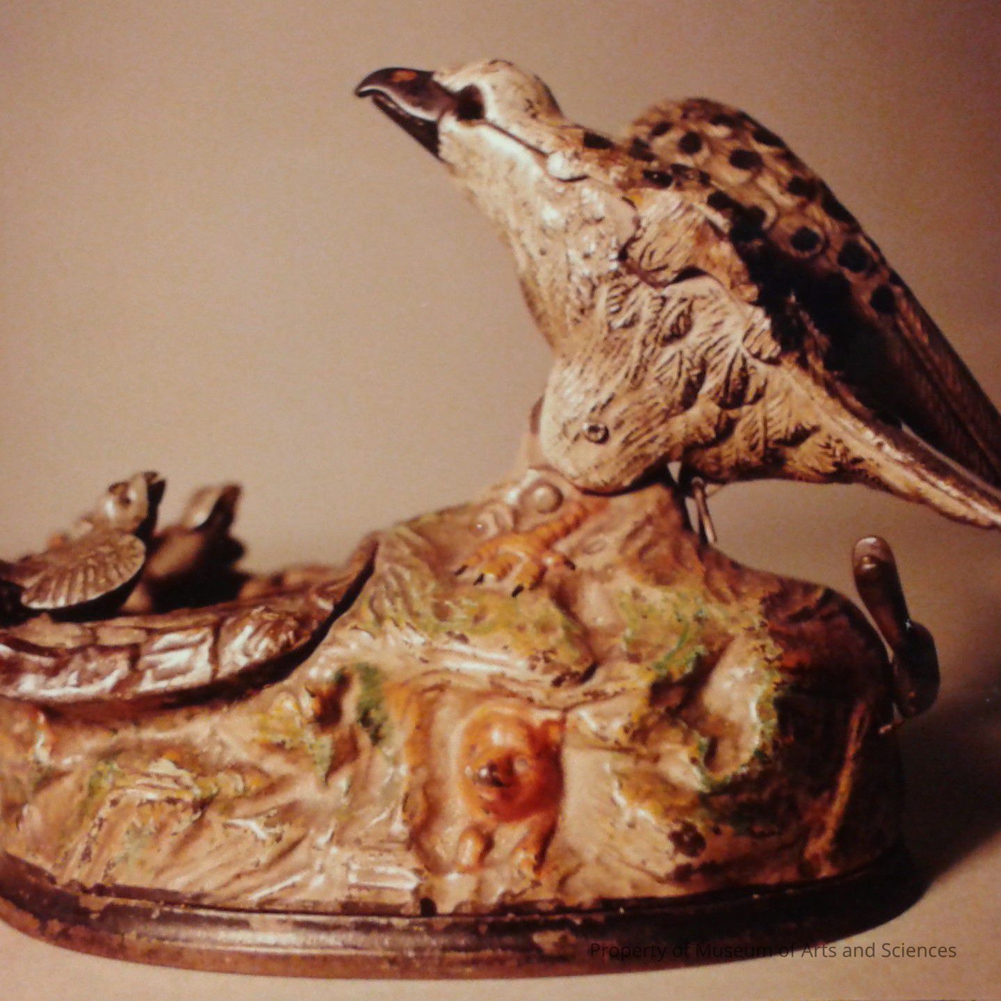 Place a coin in the Eagle's beak press the lever, and the eagles rise from the nest, actually crying for food. As the eagle bands forward to feed them the coin falls into the nest and disappears in the rectangle below.