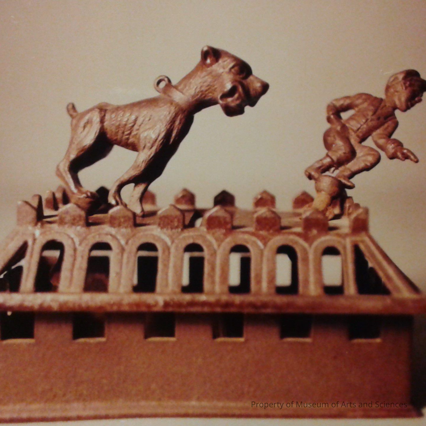 Insert a coin in the slot (between the boy and dog); pulling the lever causes the boy to lean forward as if to push the coin into the bank with his outstretched hand, the dog moves backward at the same time as the coin falls into the bank.Collection