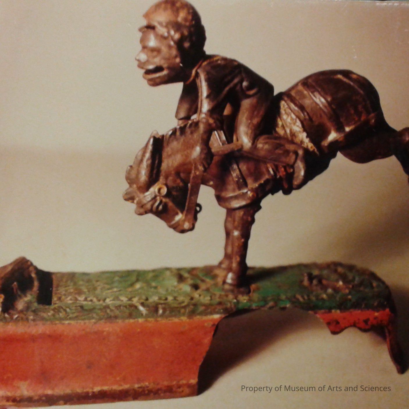 Place a coin in the rider's mouth and push the button (on base); the mule kicks up his hind legs and throws the rider forward. The rider's head strikes the log and the rider to their orginal positions.