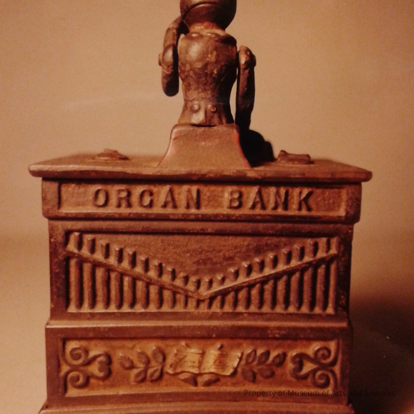 Fitted with chime of beels? and dancing figures, which revolve when the handle is turned. The monkey recieves the contributions, deposits them in the vault and pelitley raises his hat.