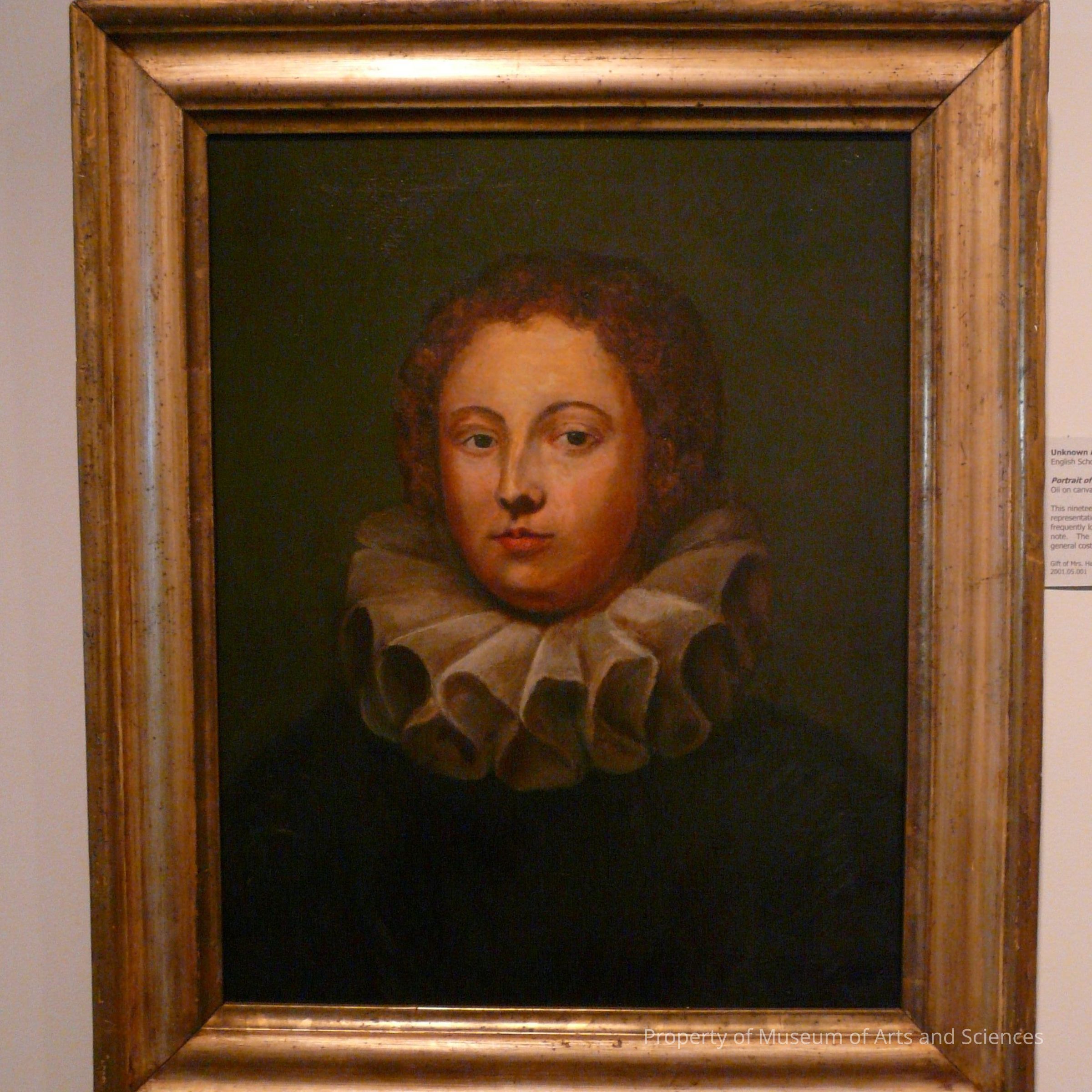 A portrait of a Lady in with high Elizabethan collar, dark dress. Mottled field. Gilt wood and gesso frame with ogee molding.
