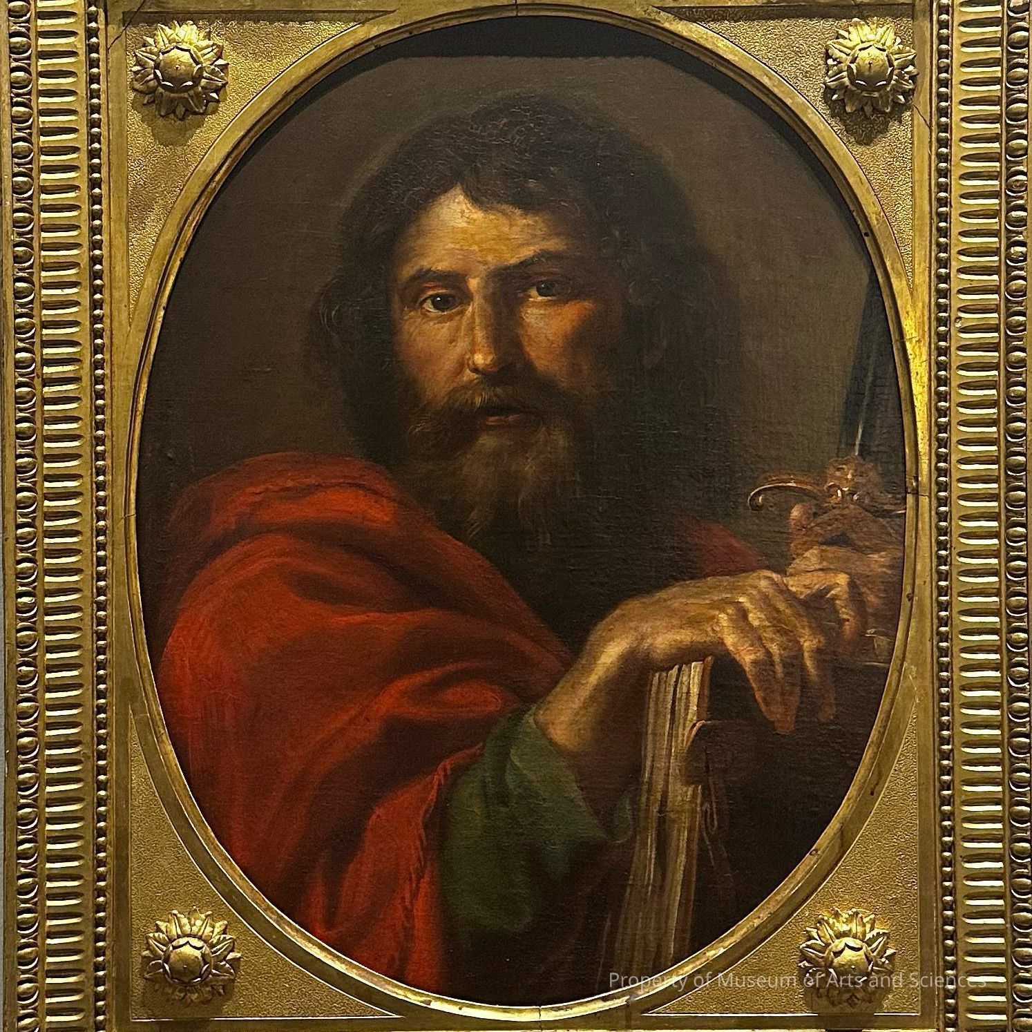 A classical portrayal of St. Paul wearing a red robe, sword in left hand, long hair with beard and mustache. Holds Bible in right hand. Mottled field. Signed and dated in lower right corner. A gilt Neoclassic frame, gilt gesso and wood with rosetted cornerCollection
