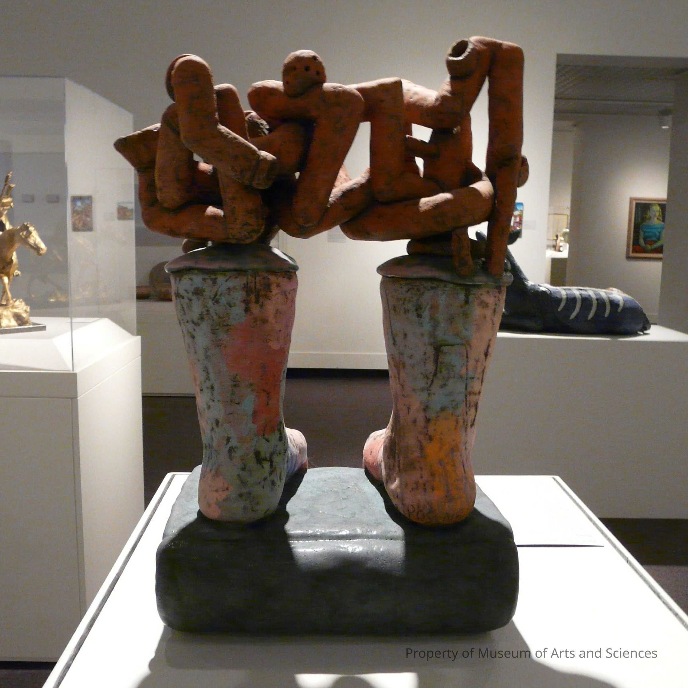 The sculpture is a large blue book with white pages with the spine to the back. The book is surrounded by two human feet, ankles and lower shins; the elongated toes are curled over the top of the book. The feet are a mottled blue and pink.Collection