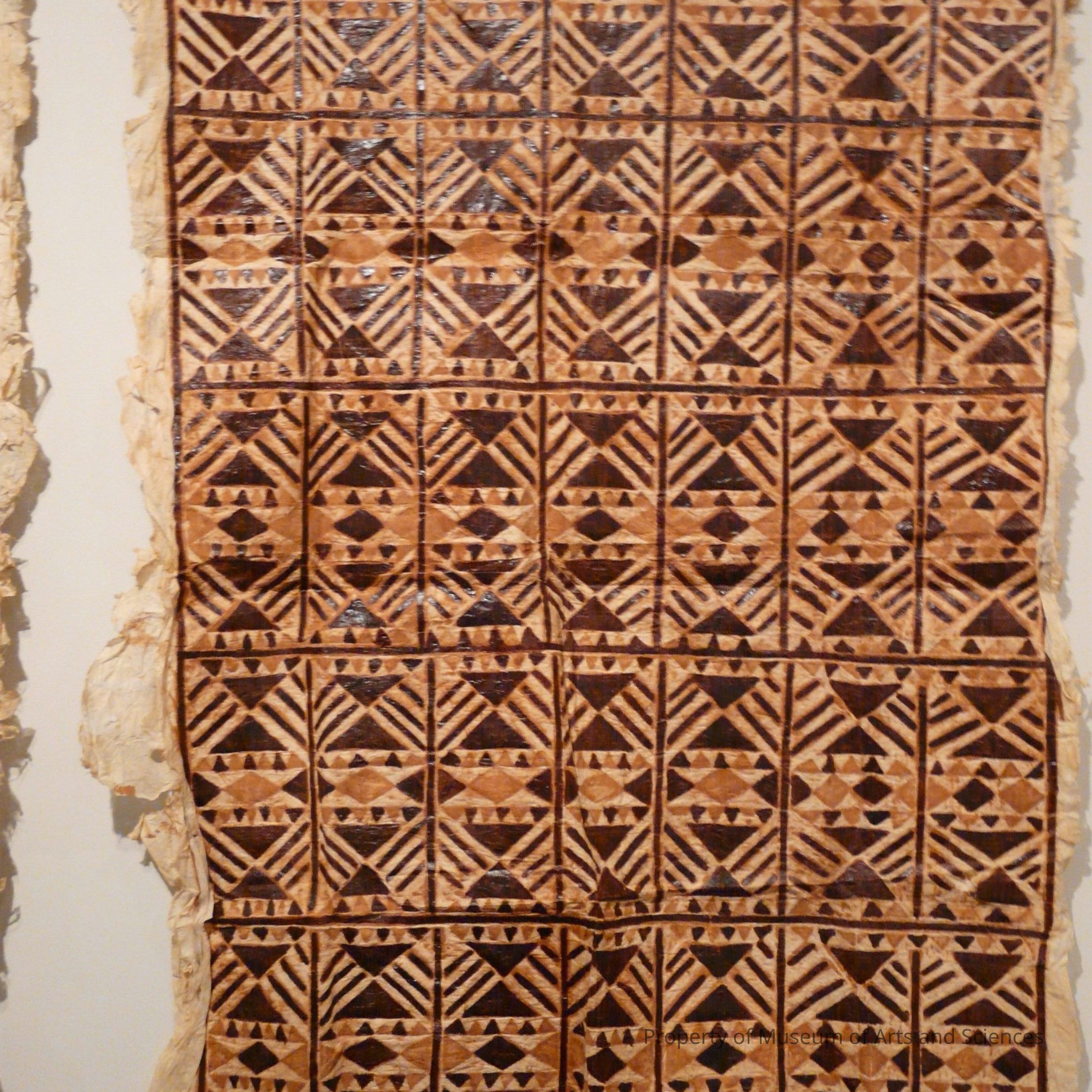 Possibly right photo Individual blocks are 7" x 14" with dark and light brown triangles, slash marks, and squares in a geometric pattern on a beige background