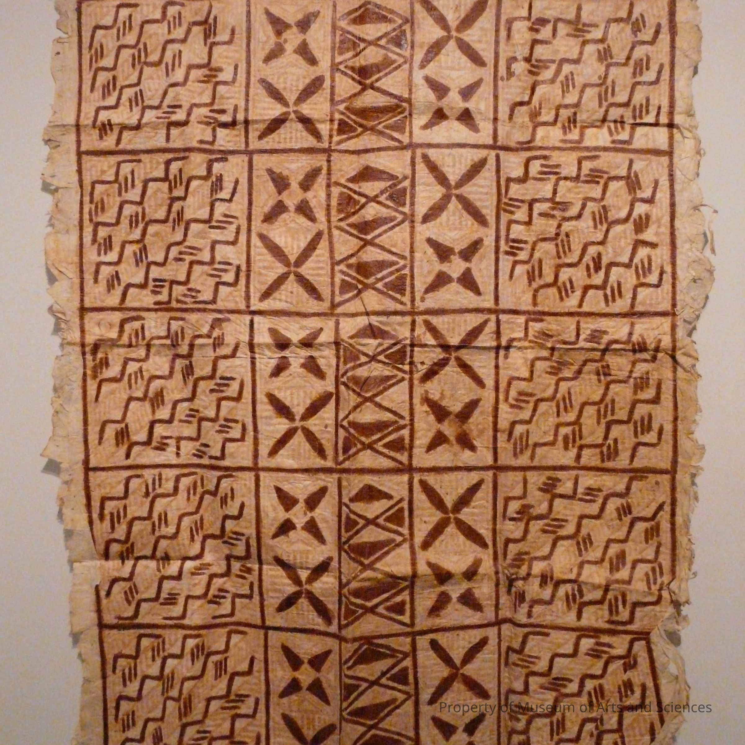 Individual perimeter blocks are 13" x 12" with medium brown wavy and slash patterns on a lighter brown pattern; central blocks 6" x 12" of X's and triangles in medium brown on a lighter brown geometric pattern, and flanked by blocks 6/5" x 12"Collection