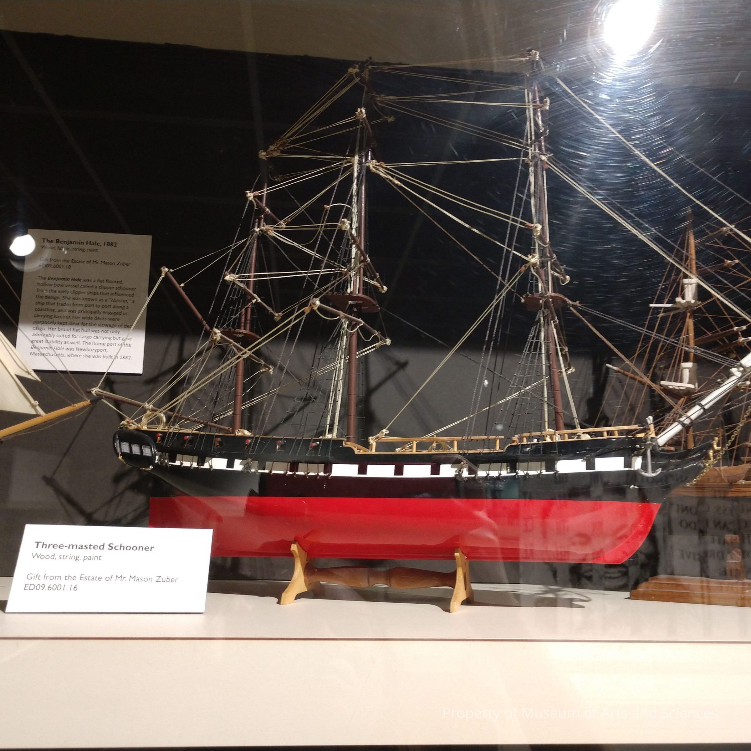 Three-mast, no sails, red keel clipper. Ship's hull is painted red, white, and black. Deck is unpainted; from Japan. Miniature brown pulley sitting between two cargo hatches. Ship rests on its stand.Collection