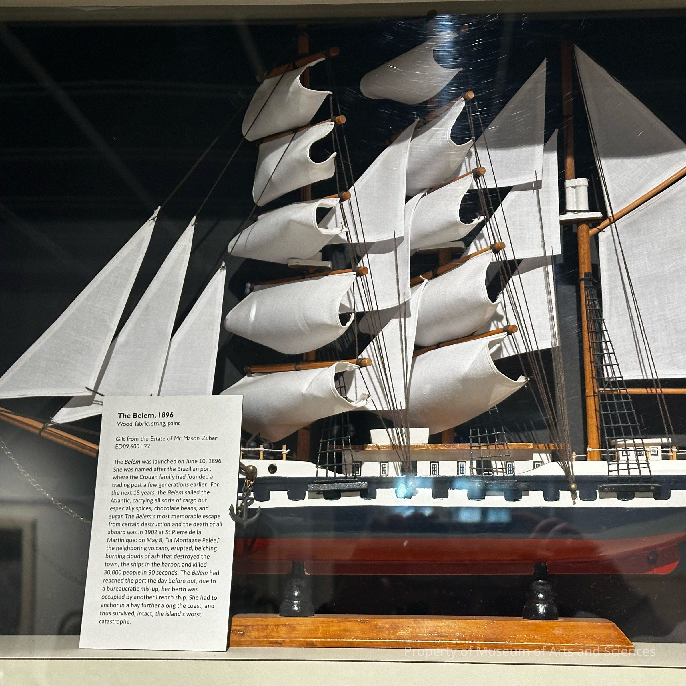 Three-mast with sails, waterline clipper has a French flag; ship is painted black with red waterline and white along top of hull; ship is on a stand.Collection