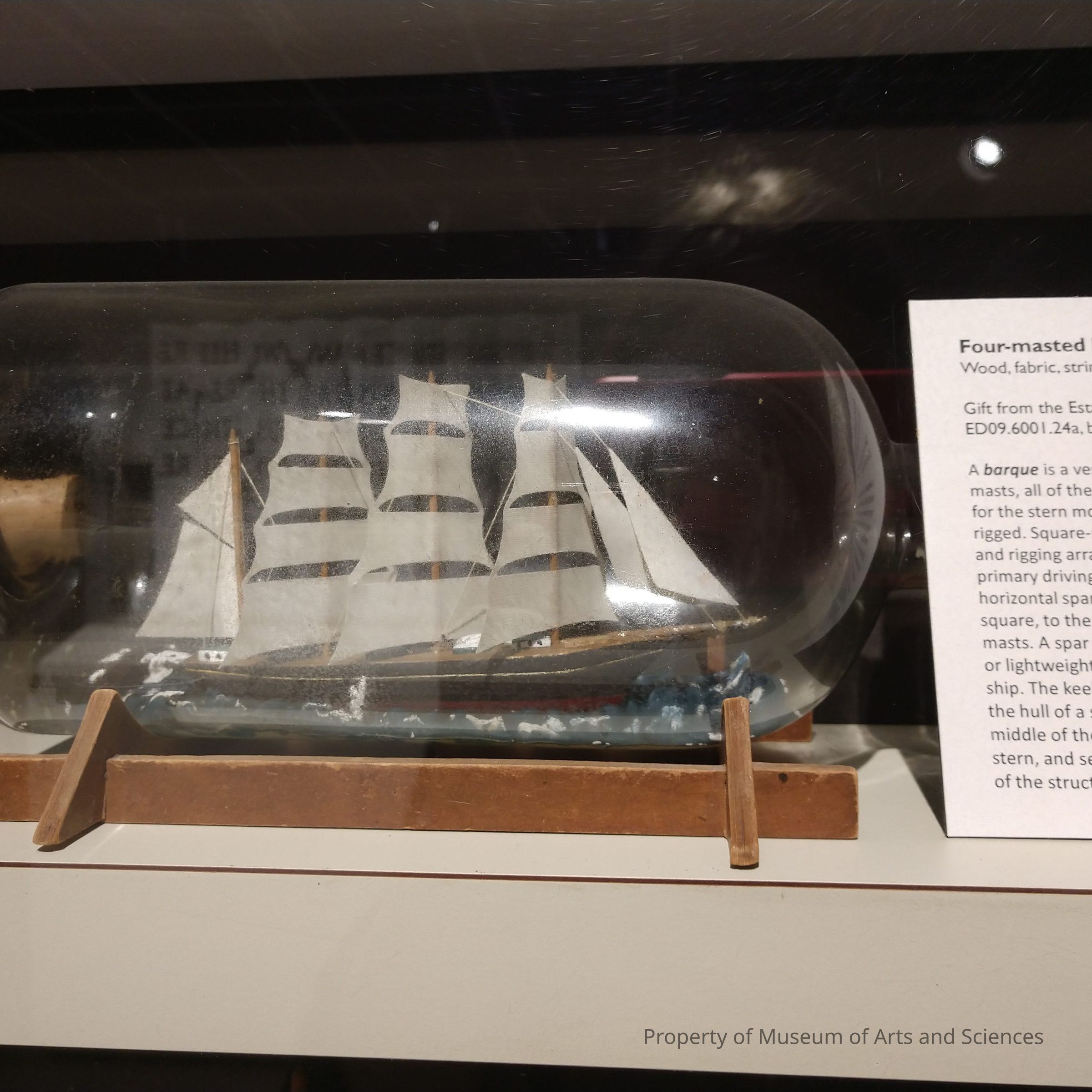 Four-mast wooden ship with sails "floats" on modeling clay ocean inside round bottle with cork; bottle rests on its wooden stand.Collection