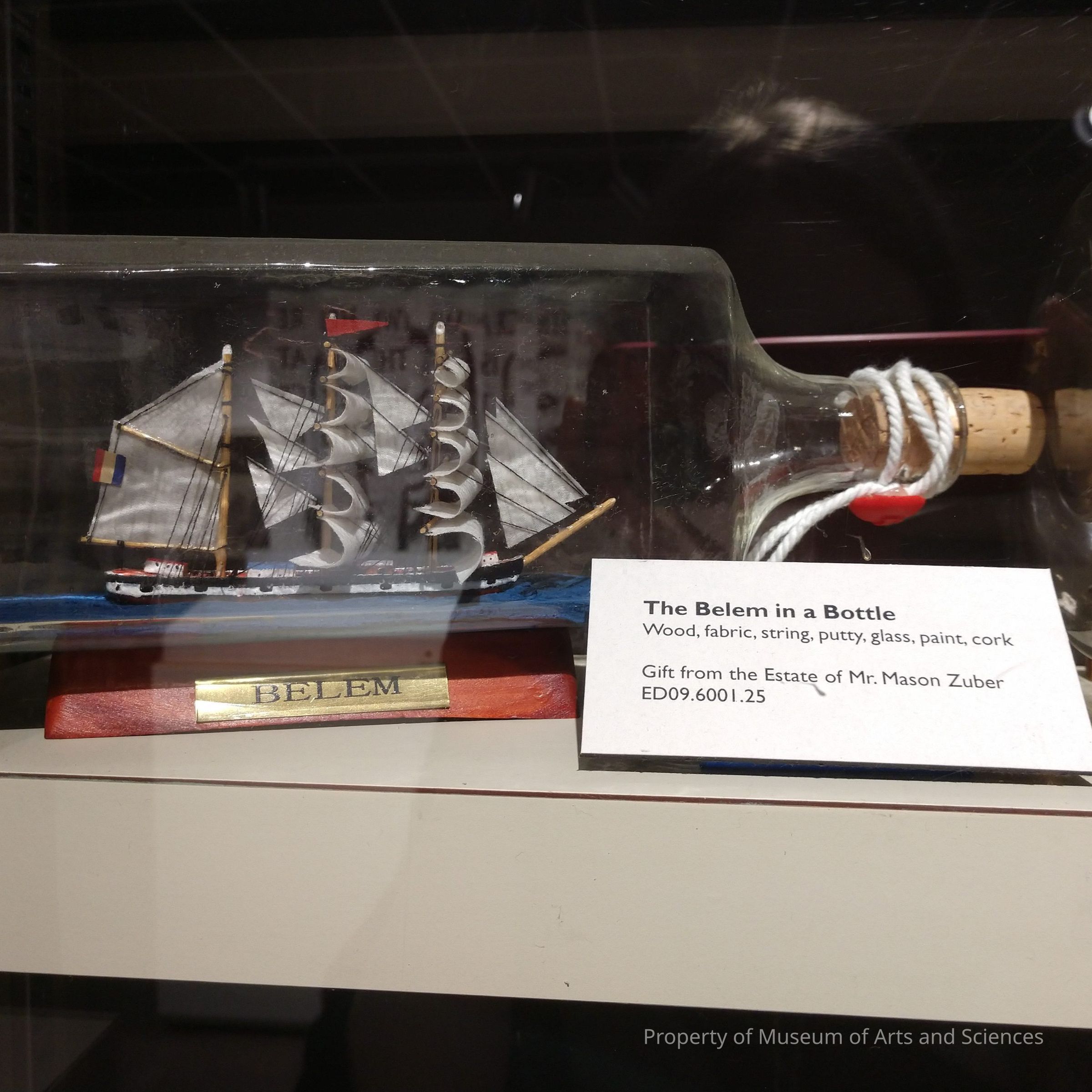 Three-mast ship with sails rests on blue modeling clay "water" inside square-shaped bottle with cork; hand-written on cork: DERBY, ENGLAND SEPT 13, 1969...(?); mouth of bottle is wrapped with white cord attached with red seal; bottle rests on red painted wooden stand with BELEM on nameplate.Collection