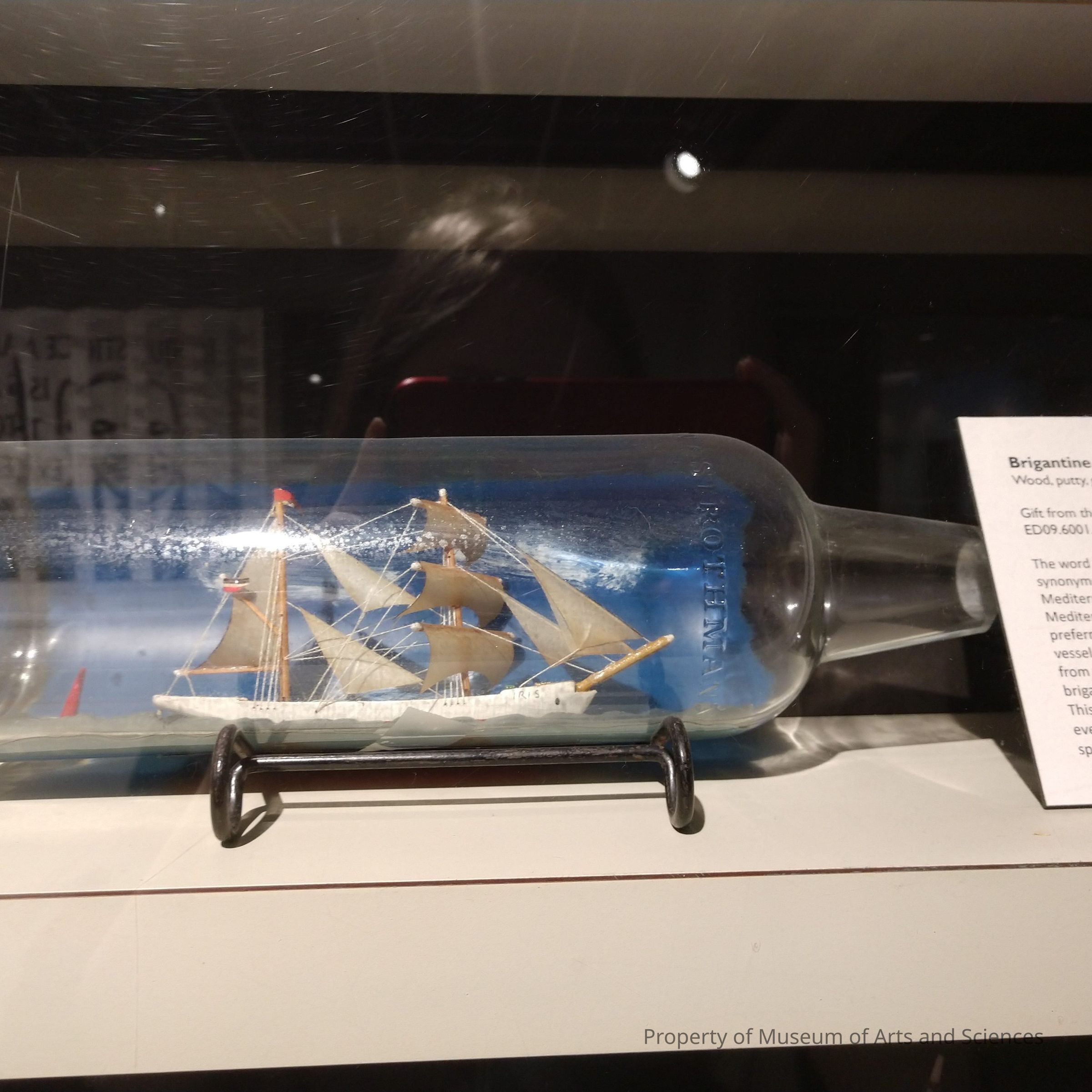 Two-mast ship with white hull "floats"on grey modeling clay "water"inside glass bottle; side of bottle behind ship is painted blue; bottle rests on a curved metal stand.Collection