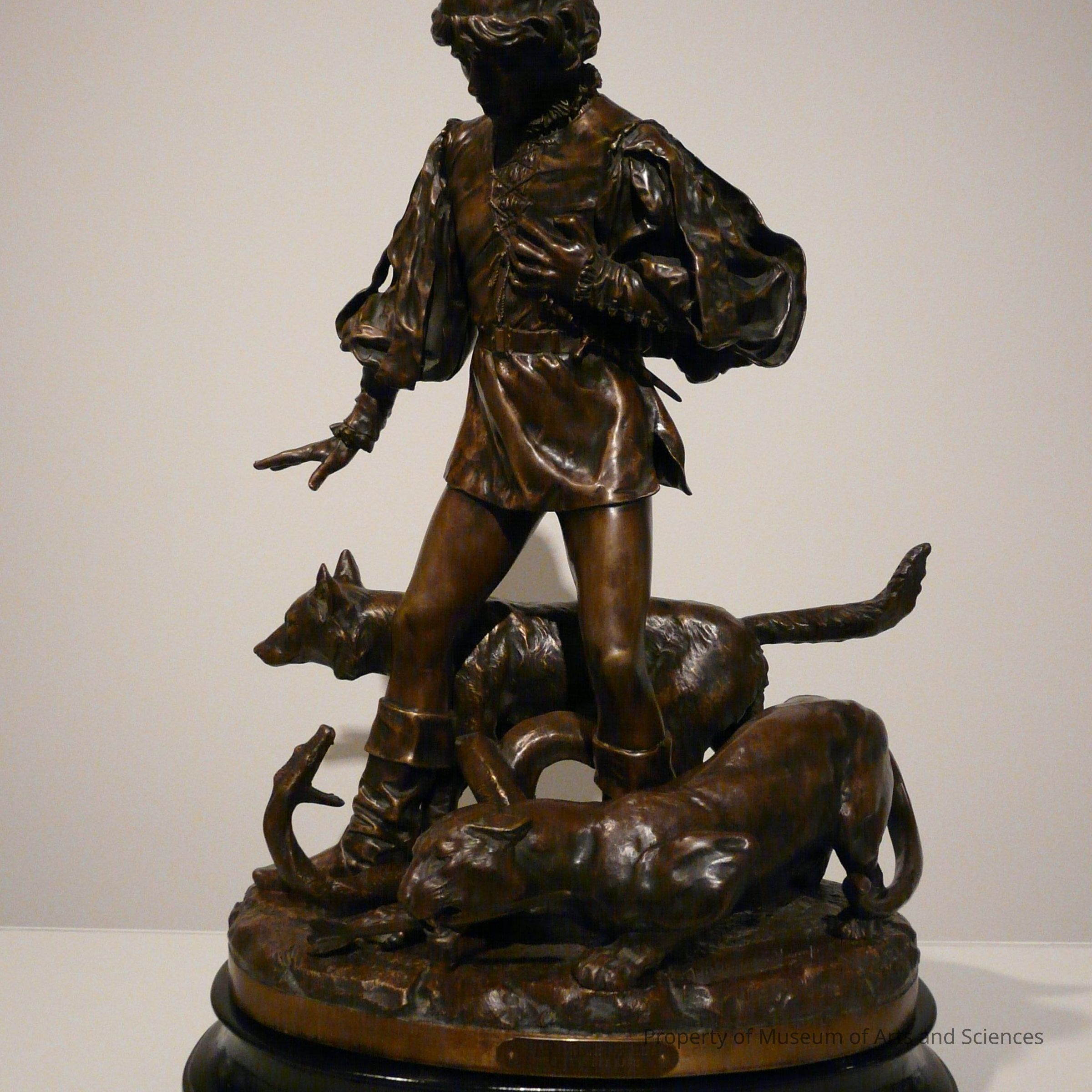 Sculpture of the young and terrified hunter in Renaissance costume is surrounded by his previous quarries: a lion with an arrow in its mouth; a snake coiled to satrike at the hunter's feet; and a dog/wolf on the right side.Collection