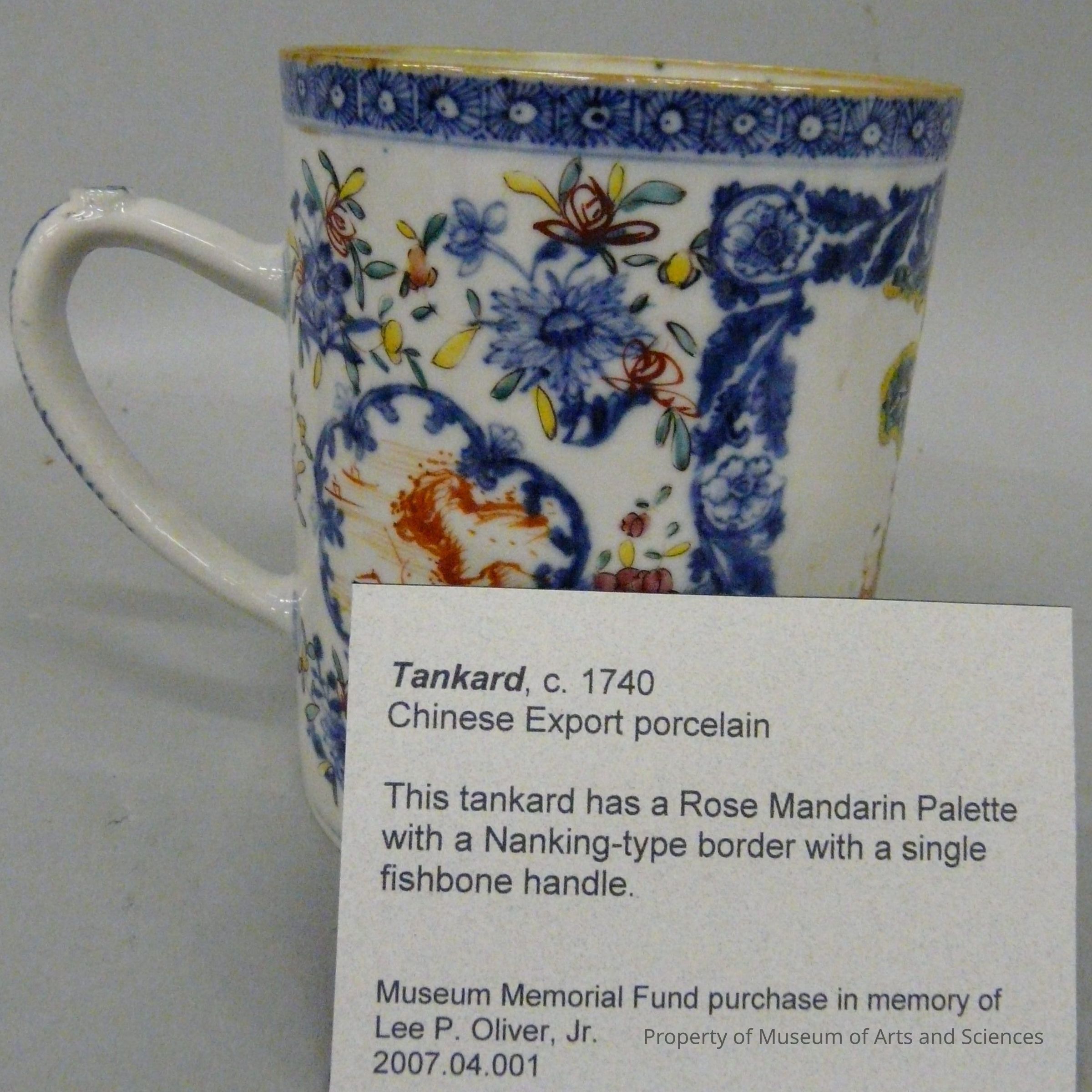 Museum quality example of a tankard in Rose Mandarain palette with a Nan-king style border. Fish roe rim design with a single fishbone handle. Three diaper patterns - one large square diaper on face of tankard with smaller diaper appearing on each sideCollection