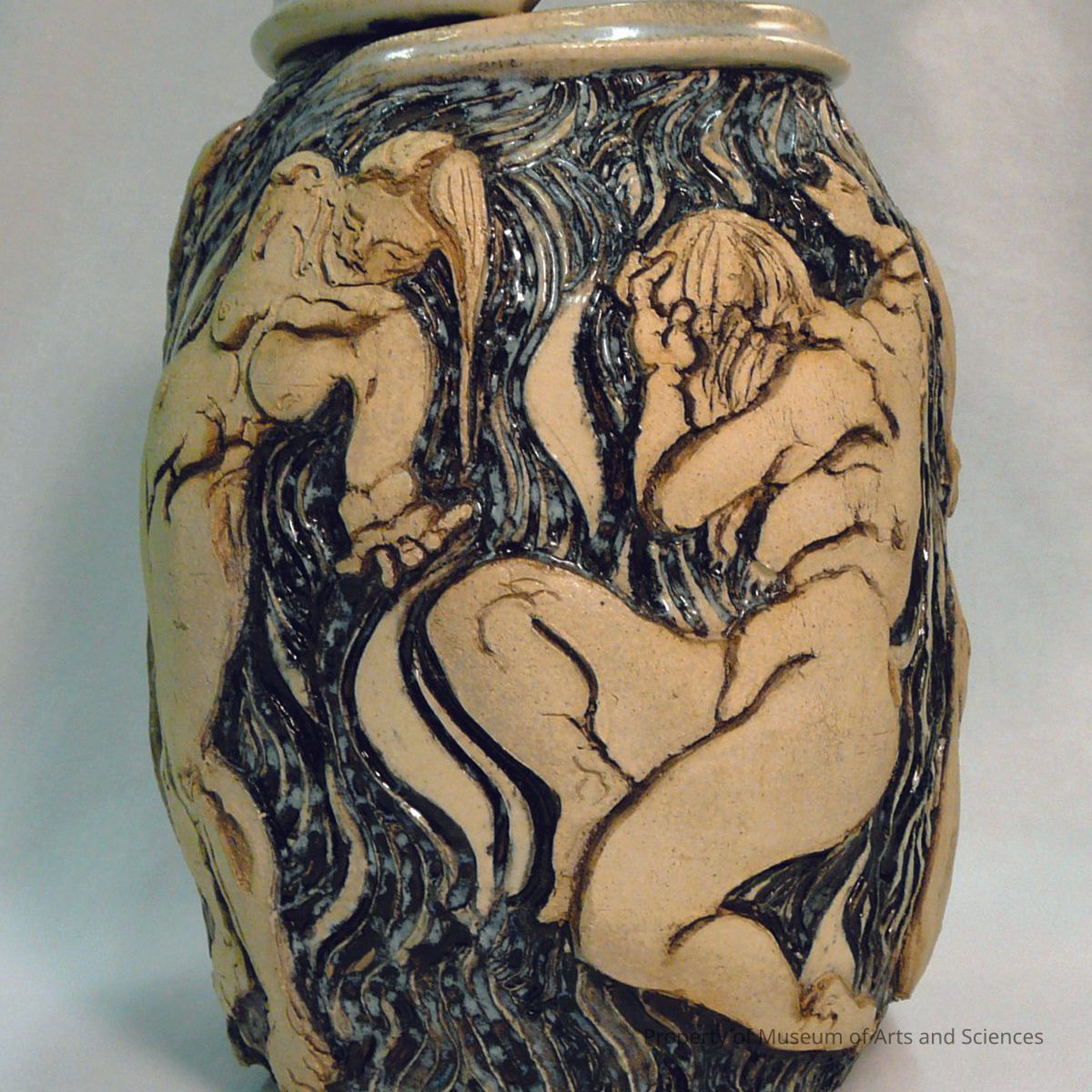This is a cylindrical jar with a flat base and applied, distorted rim. The surfaces are worked in swirls of black and beige and highlight the distorted bodies of four nude female figures the encircle the vessel and supply dramatic movement to the piece. Lori-Gene is an Atlanta artist best known for her two-dimensional work. This is an example of her creative work in clay. It represents another solid addition to the Museum's ceramic collections.Collection