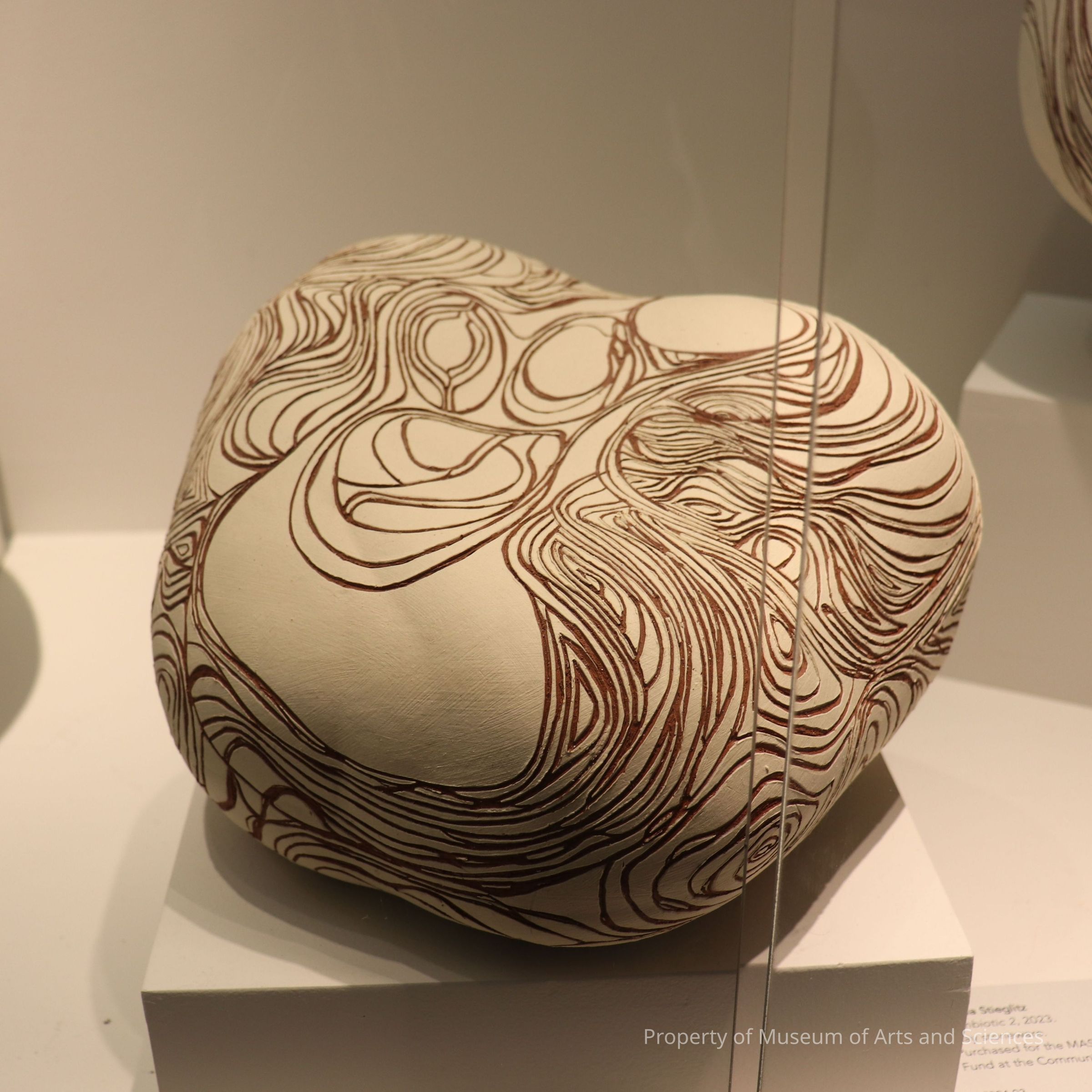 Off-white, bulbous, hollow form w/ etched, rust-colored, string-like design