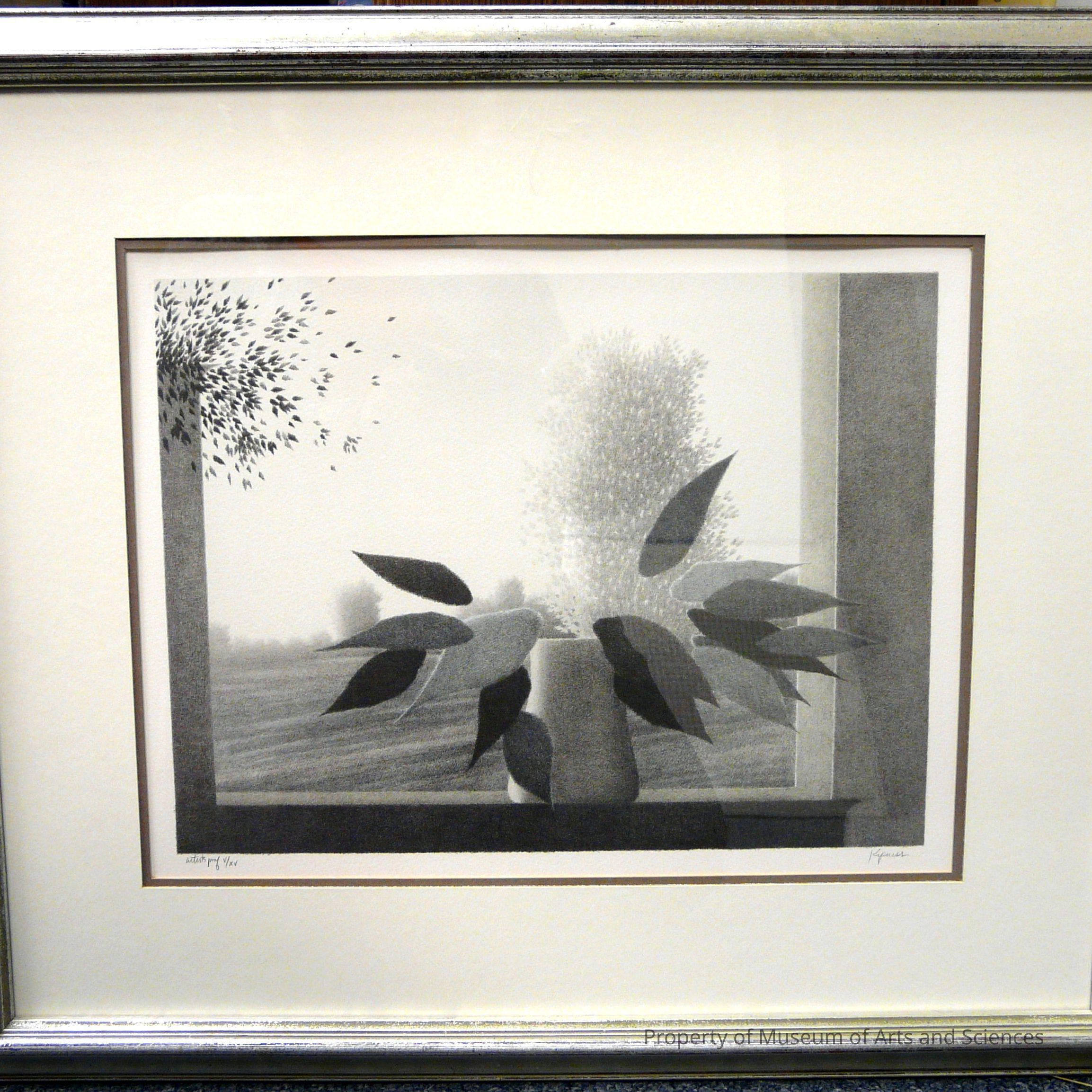 Vase with leaves sits in the frame of a window beyond which is a faint landscape